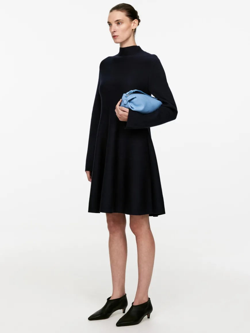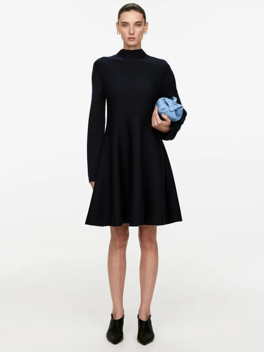 Mock-neck dress crafted from a double face knit fabric. Designed with long sleeves and an A-line short skirt. The dress contains 60% RWS wool (TE-00047206). Products certified to the Responsible Wool Standard (RWS) contain wool fiber from farms independently certified to animal welfare and land management requirements.