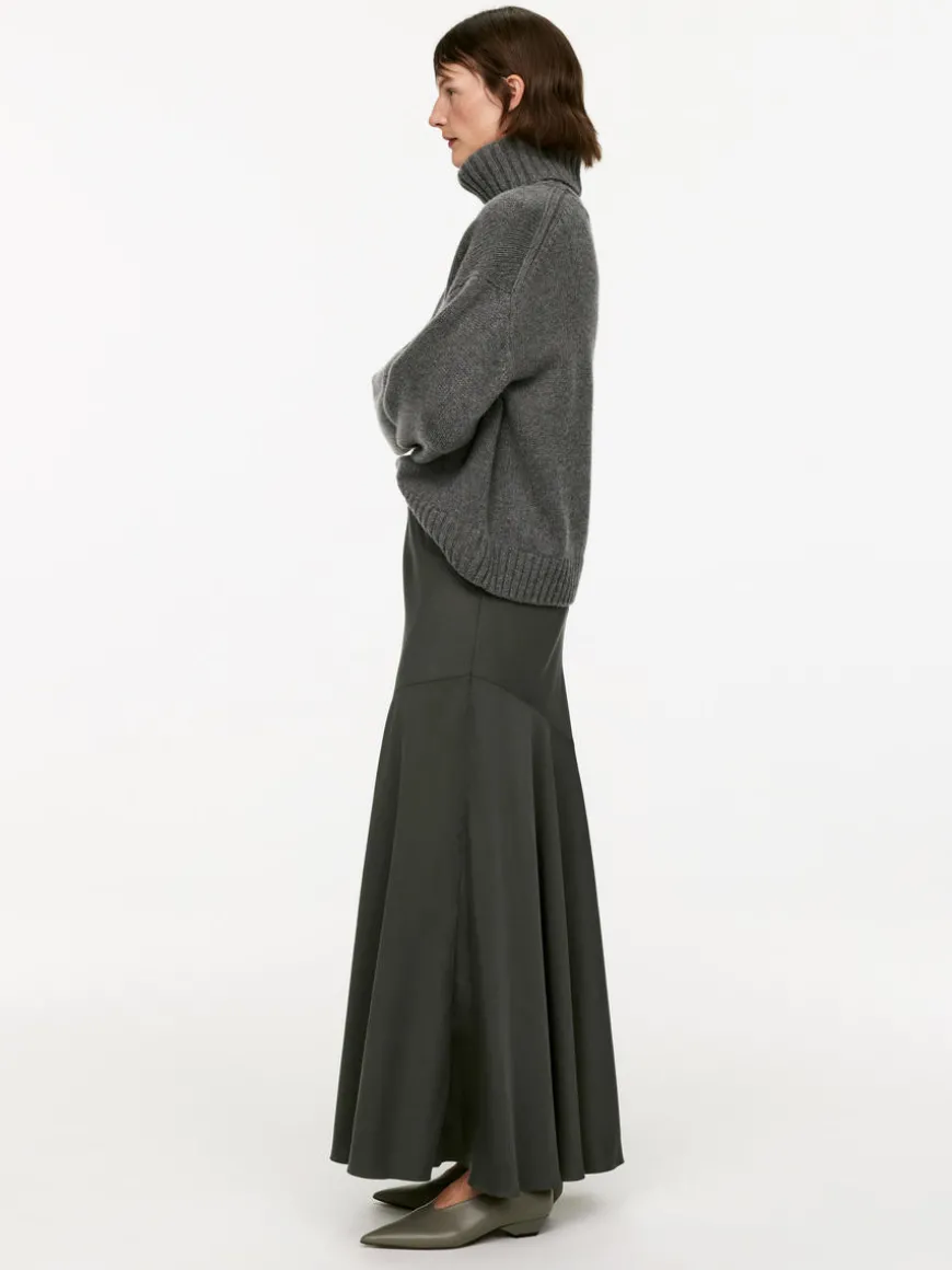 Straight-cut skirt styled with a diagonal cut seam and a regular waist with elasticated edge.