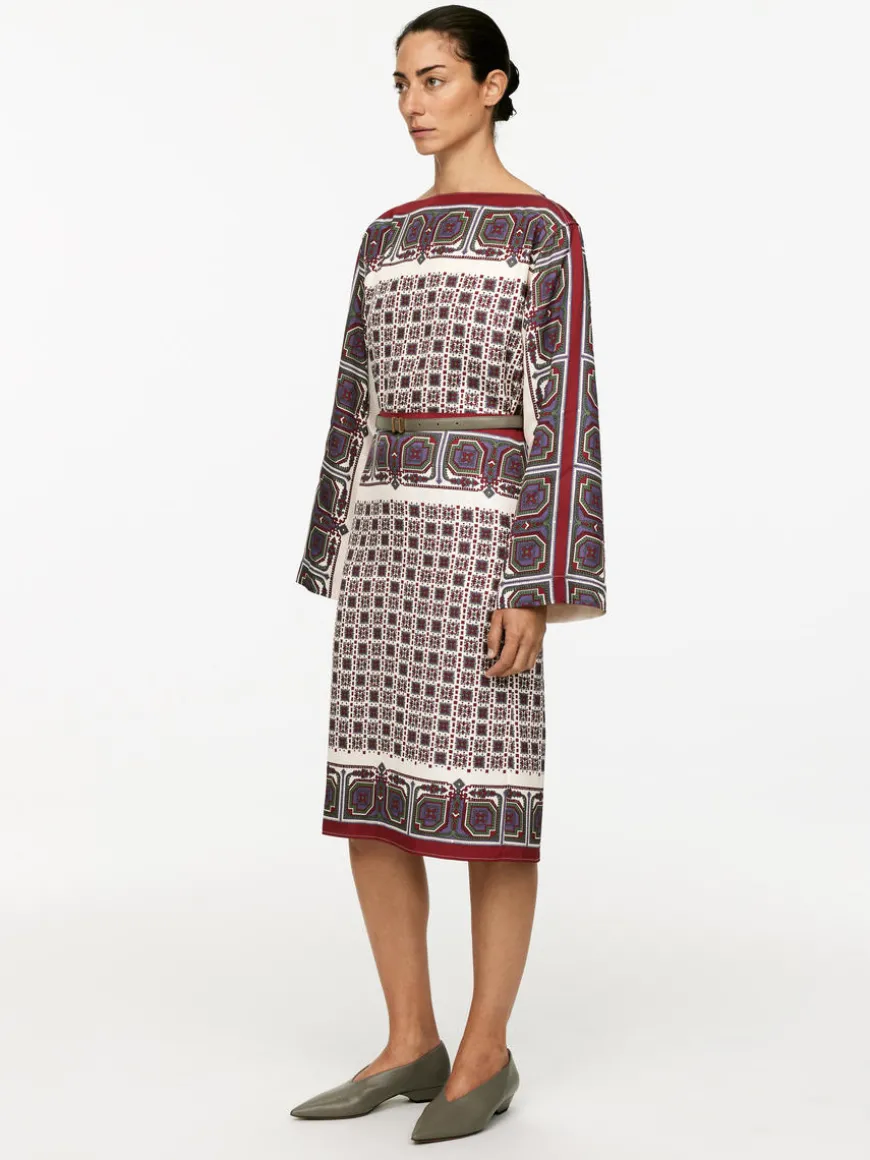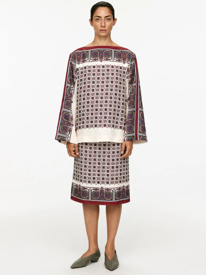 Mid-length pencil skirt with a placement print. Hidden zip closure at side seam and slit at centre back. Unlined.