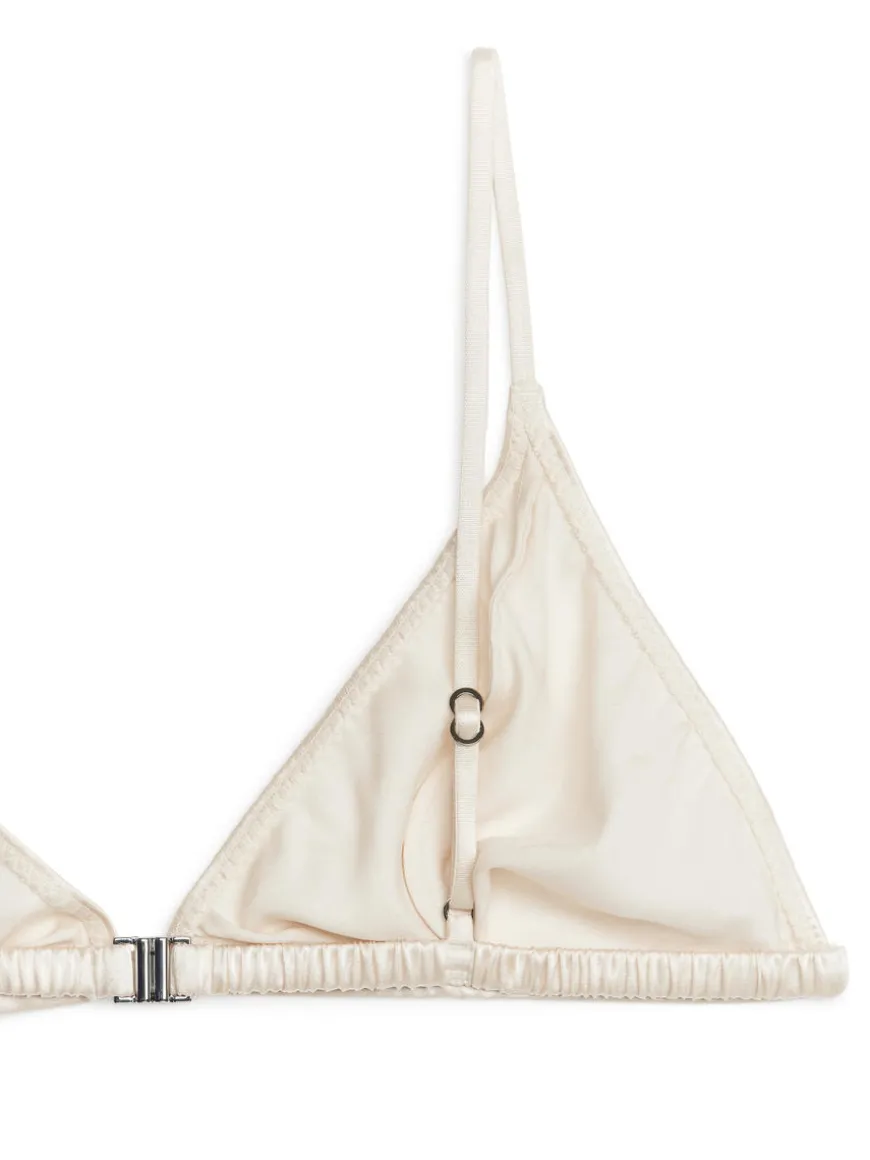 Soft bra in luscious mulberry silk satin with a touch of elastane for flexibility. Styled with triangular cups, ruched back strap with buckle and elasticated shoulder straps.