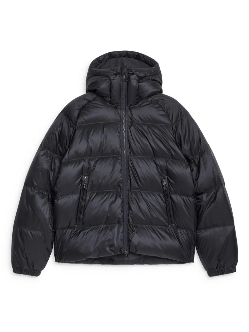 Sporty down jacket with a regular, puffy fit. Made with a polyester shell and filling made from a blend of feathers and down. Styled with a down-filled hood and double jetted pockets at front. Smart detailing include a two-way zip at front and elastics at cuffs, bottom hem (adjustable) and hood opening (adjustable). The Upcycled Down products are filled with recycled down and feathers sourced from Re:Down®. These materials, collected from used textiles, are washed and sterilised at high temperatures without the use of chemicals.