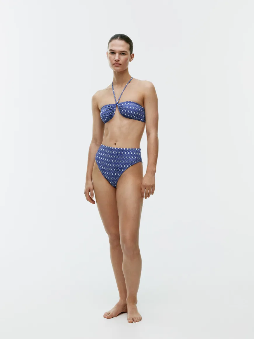 Bandeau bikini top with removable halterneck straps. A wired style with gathers at cups and removable pads. Fully lined. Mid support.