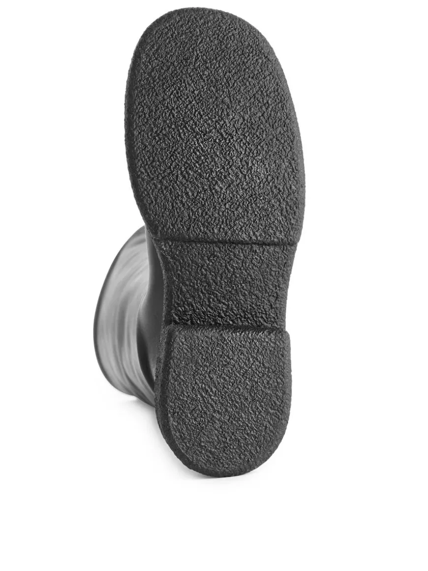 Leather boots with a chunky rubber sole. Knee-high shaft in soft stretch leather.