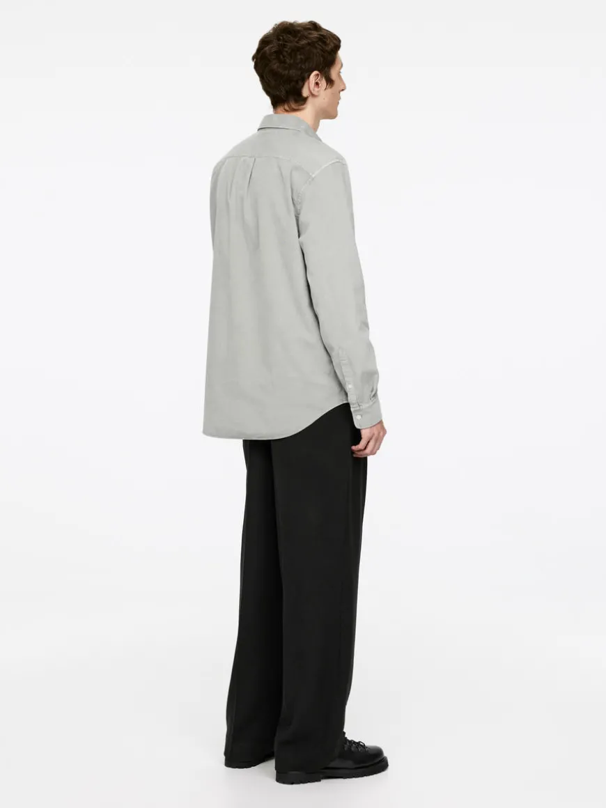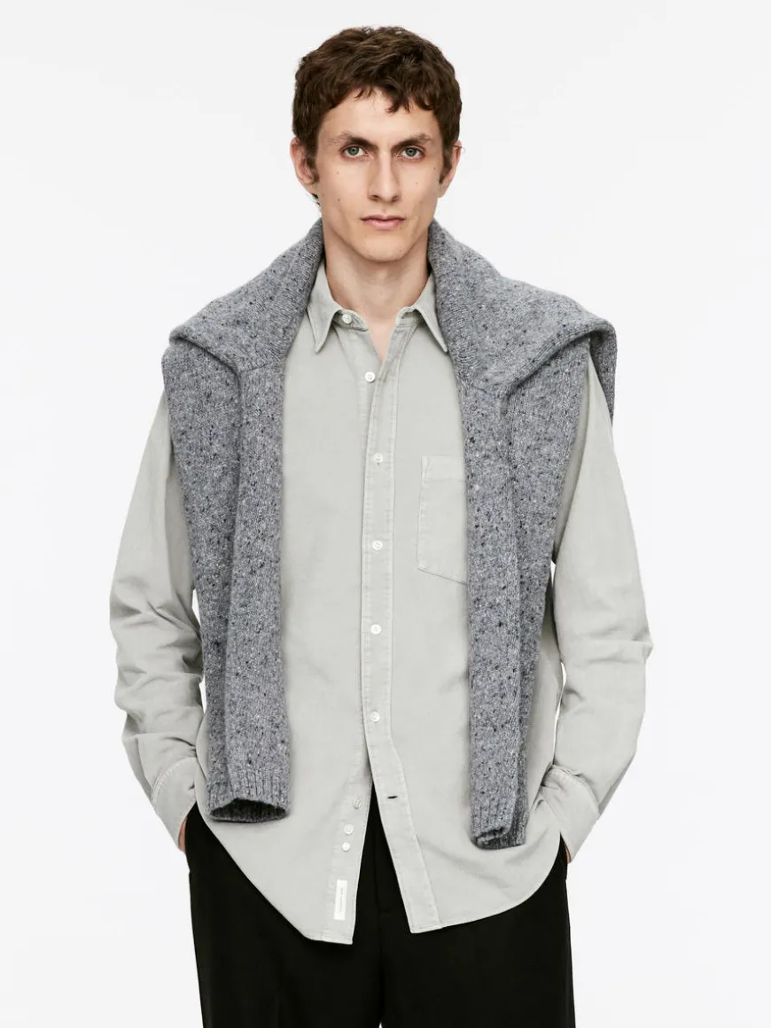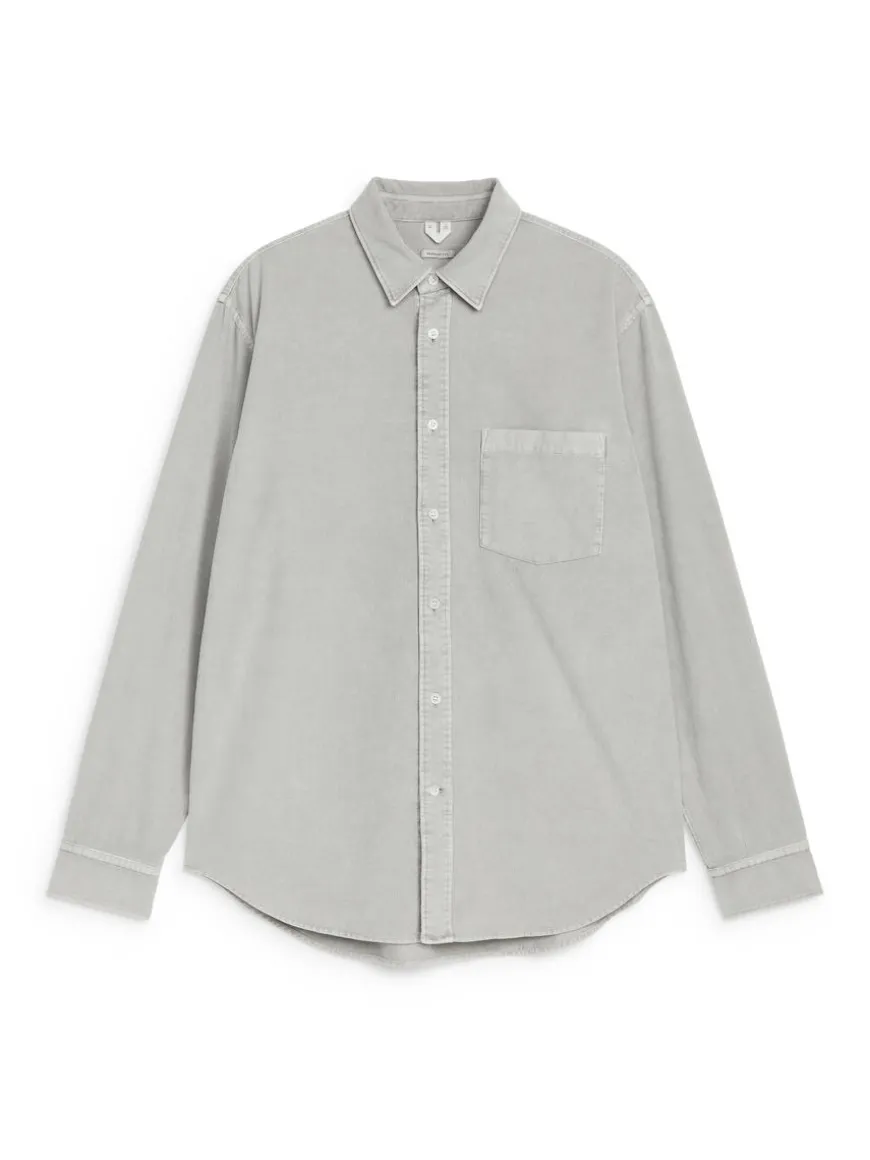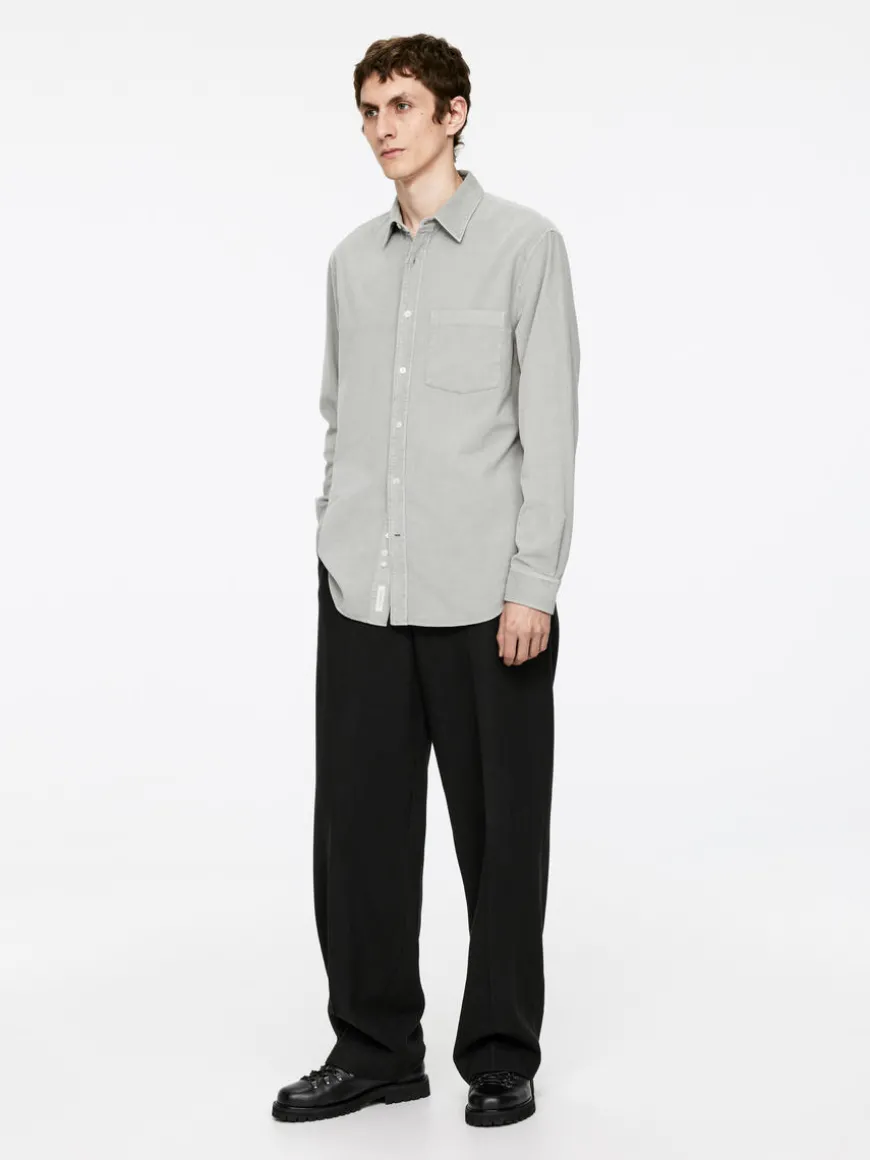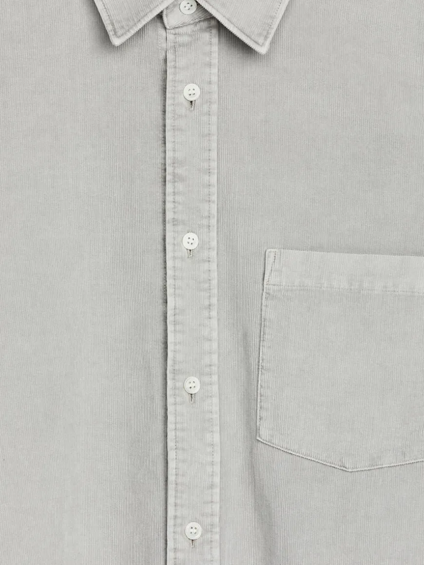 Corduroy shirt made of cotton. A button-up style with a single chest pocket and buttons at cuffs.