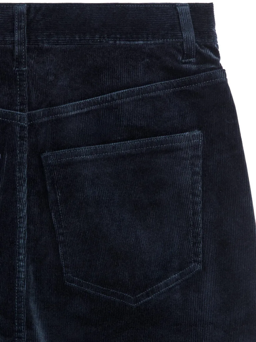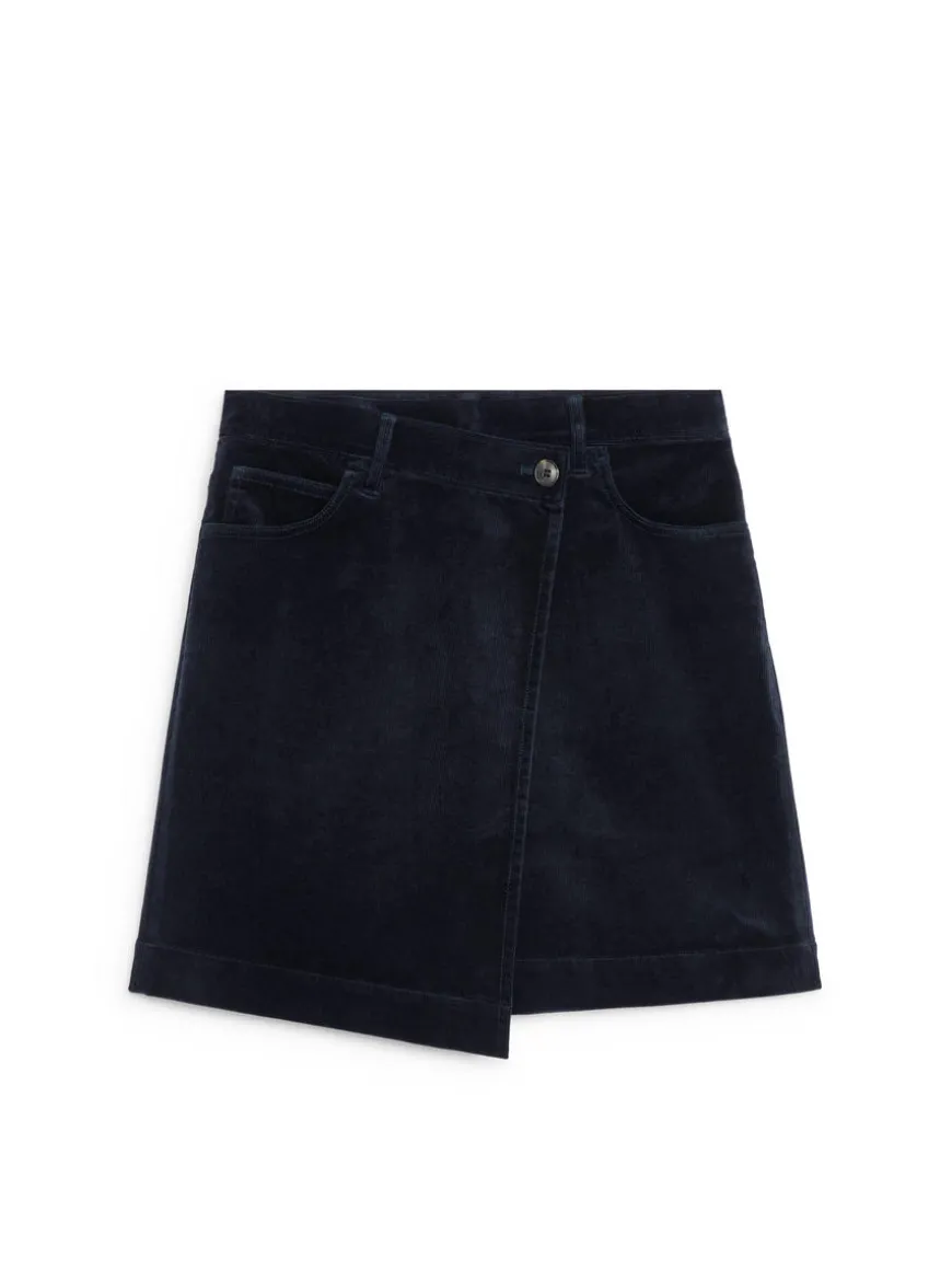 A-line mini skirt in a soft corduroy fabric. A five-pocket style with an asymmetrical wrap front and button closure.