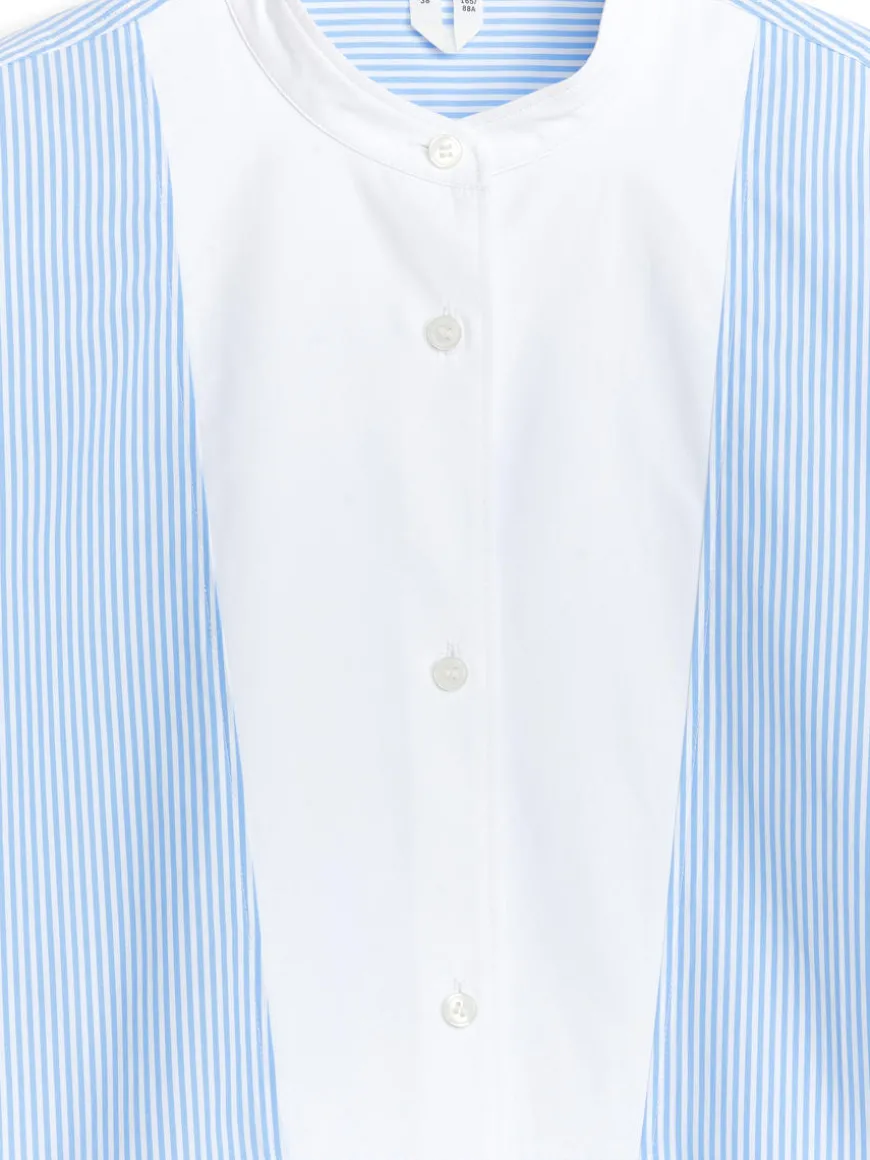 Short dress inspired on a tuxedo shirt sewn from a cotton poplin. This style features a bib front panel in contrasting colour. Regular fit.
