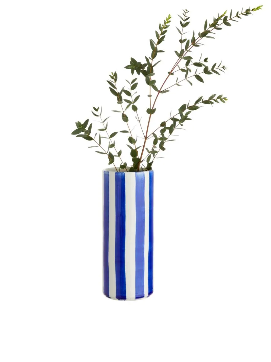 Crafted from terracotta, this cylinder shaped vase features at shiny glaze with a distinct pattern.