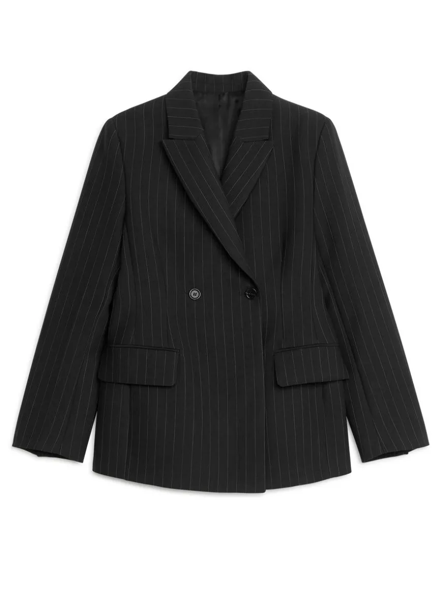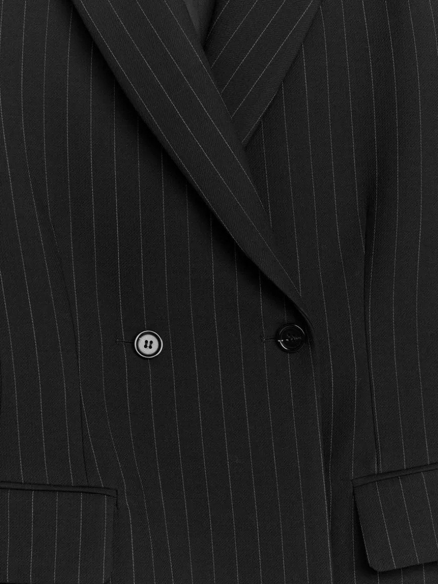 Double-breasted blazer in a wool and polyester blend. This is a fully lined style with hidden closure and peak lapel collar.