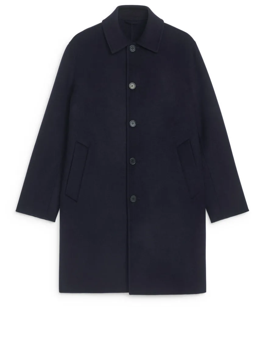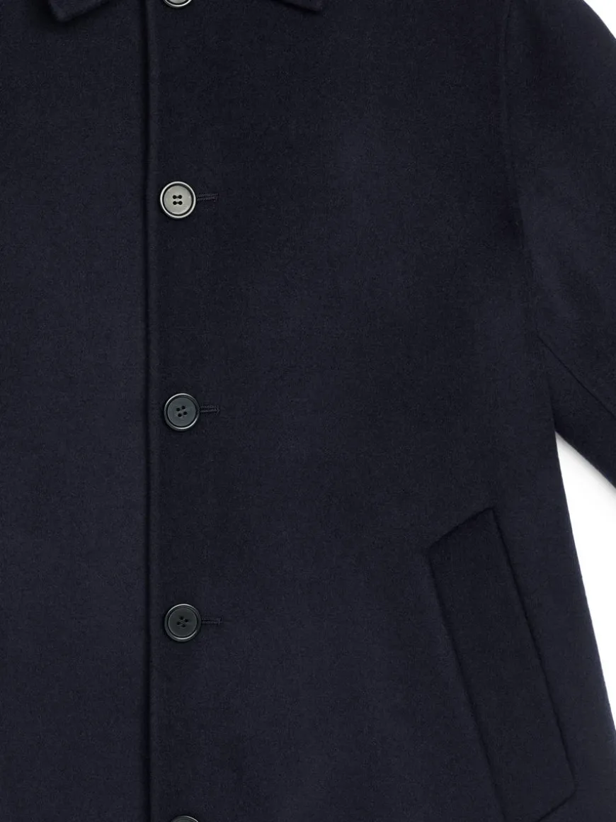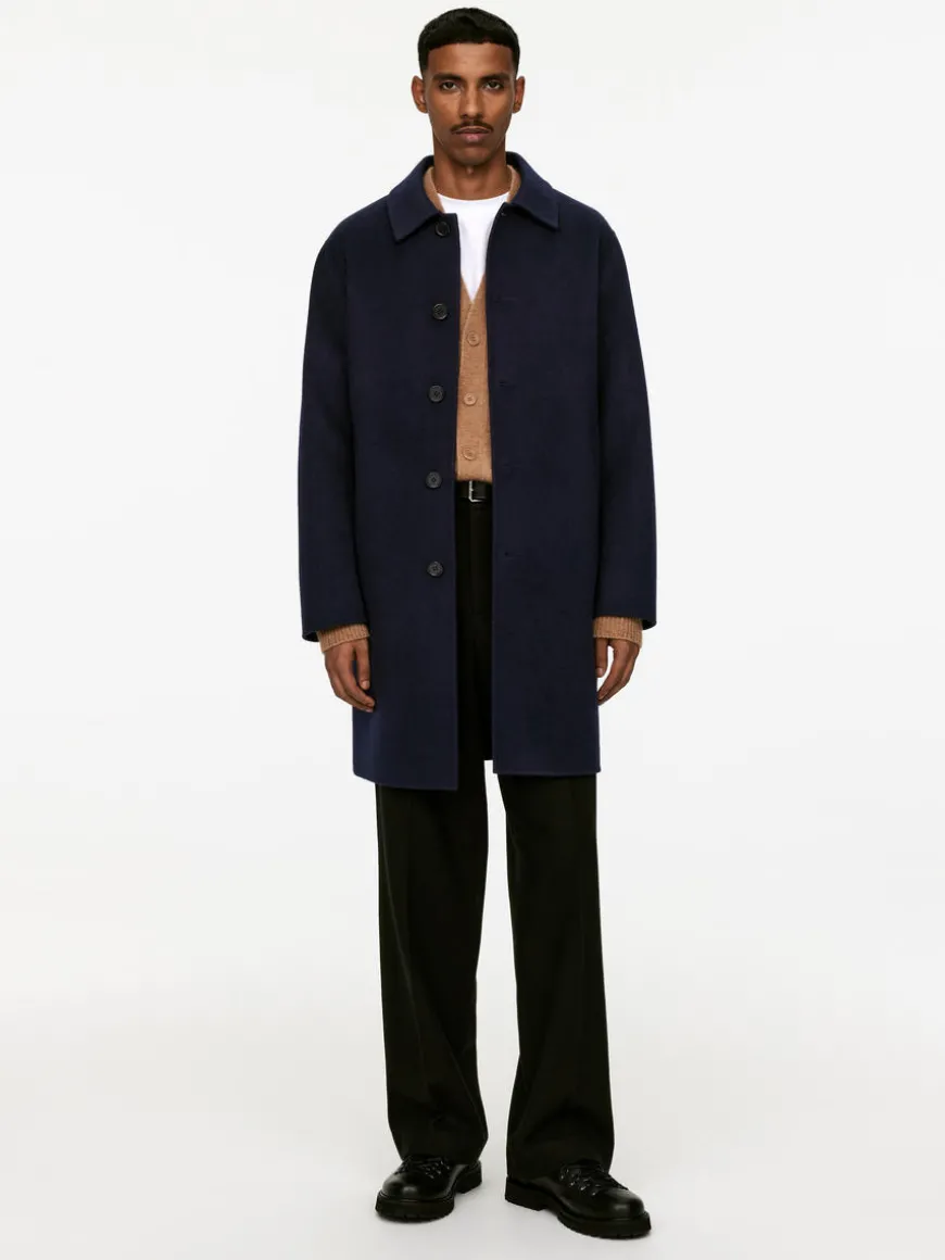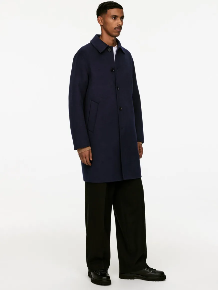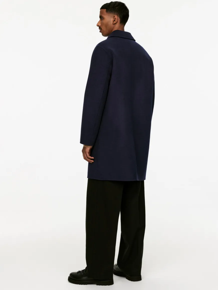 Coat crafted from an exclusive double-face wool blend fabric, finished without any visible stitching. Cut in a regular fit that falls just above the knee. The clean, unlined design is enhanced with a plain button closure, cut-and-sew pockets, and a simple spread collar. The coat contains 80% RWS wool, certified by control union 866731. Products certified to the Responsible Wool Standard (RWS) contain wool fiber from farms independently certified to animal welfare and land management requirements.