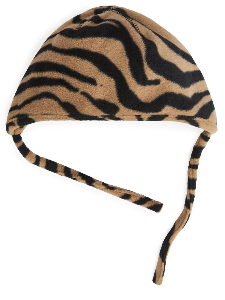 Snuggly beanie in soft and warming fleece. Styled with straps to tie under the chin.