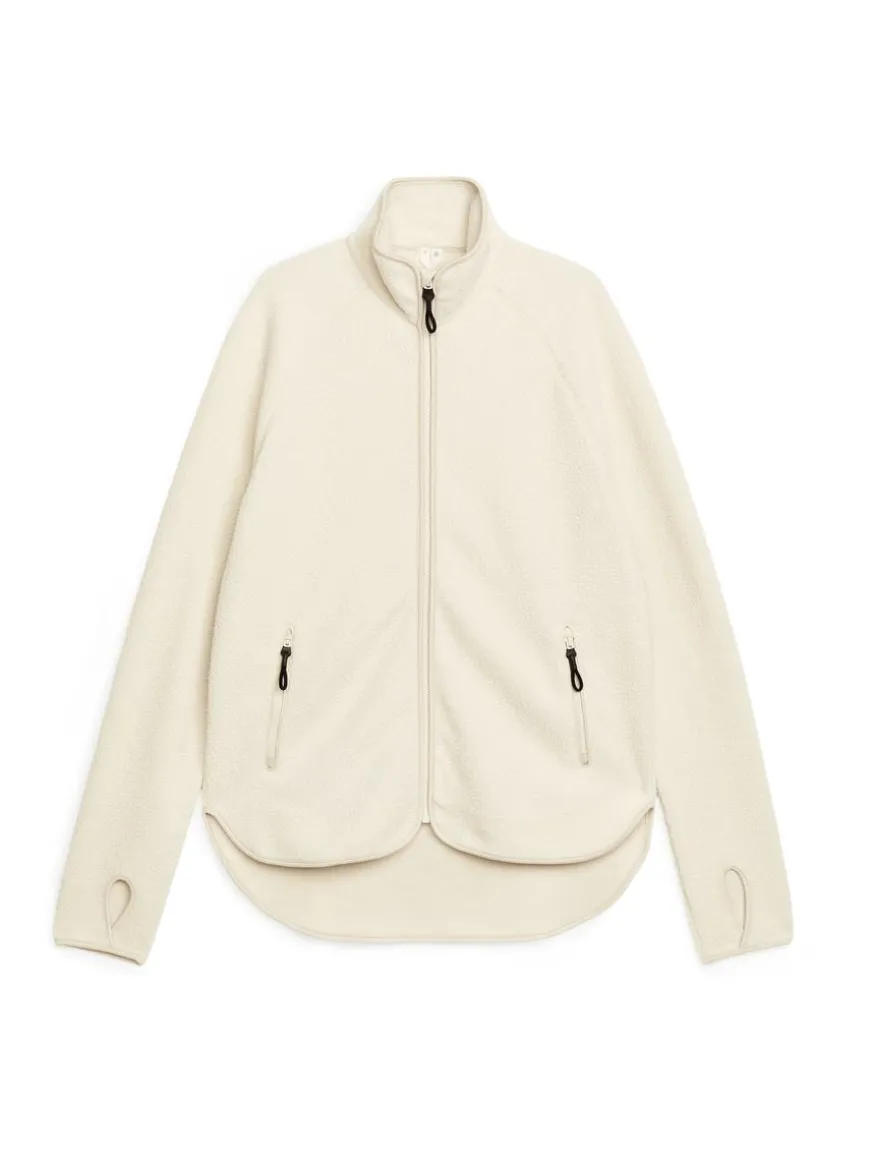 Jacket crafted from a warming fleece fabric. Cut for a regular fit and slightly longer at back. The jacket features a high collar with front zip and raglan-cut sleeves with thumbholes.