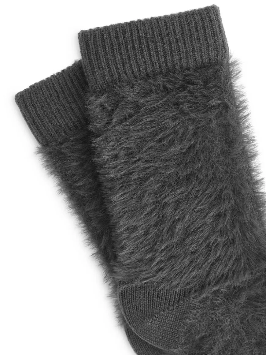 Socks with a fluffy structure made from a stretchy polyamide and wool blend. Styled with ribbed tops. These socks contain 16% RWS wool, certified by control union 811083. Products certified to the Responsible Wool Standard (RWS) contain wool fiber from farms independently certified to animal welfare and land management requirements.