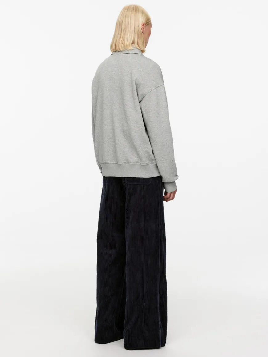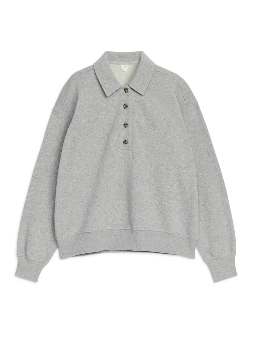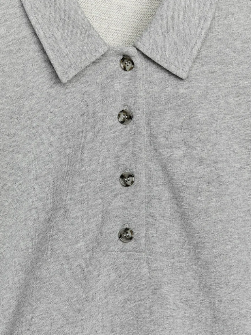 Loose-fitted polo shirt crafted from cotton with a French terry underside for moisture-wicking properties. Styled with shirt collar and button closure. Ribbed trims.