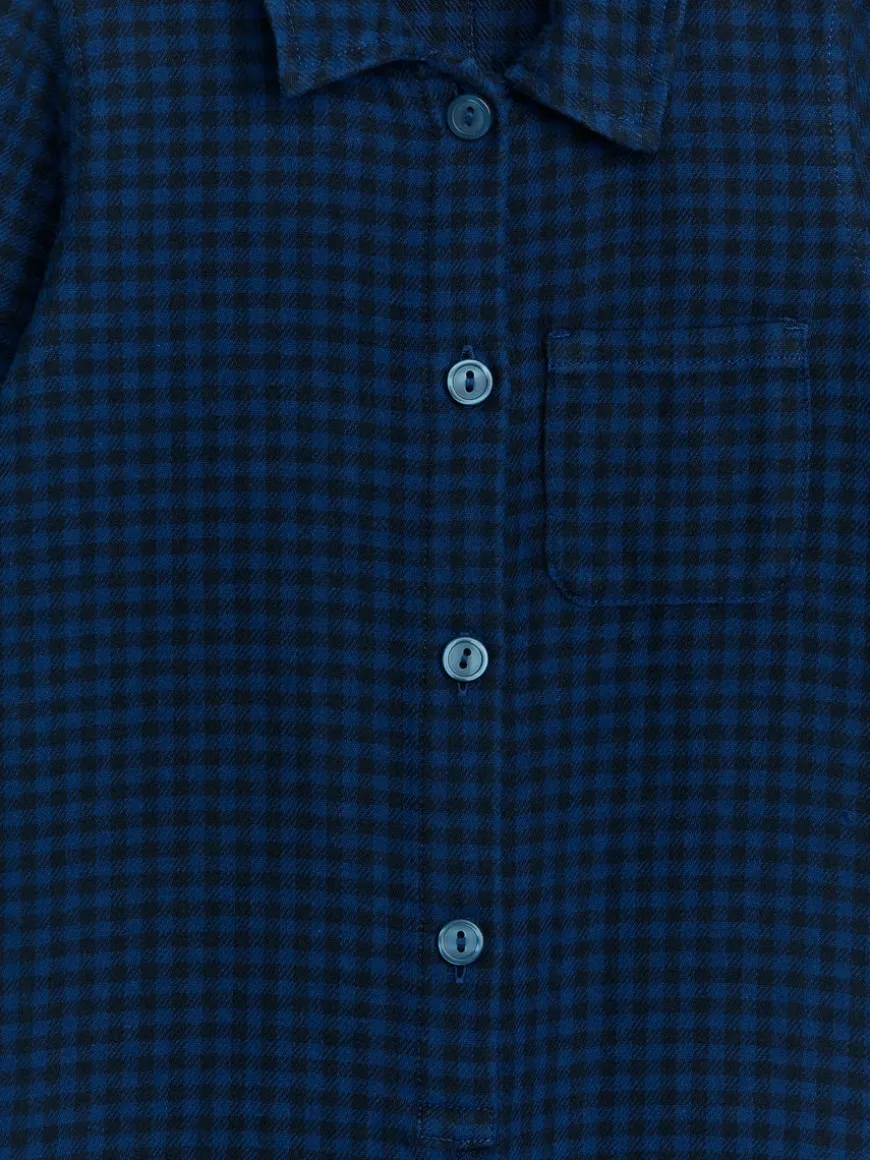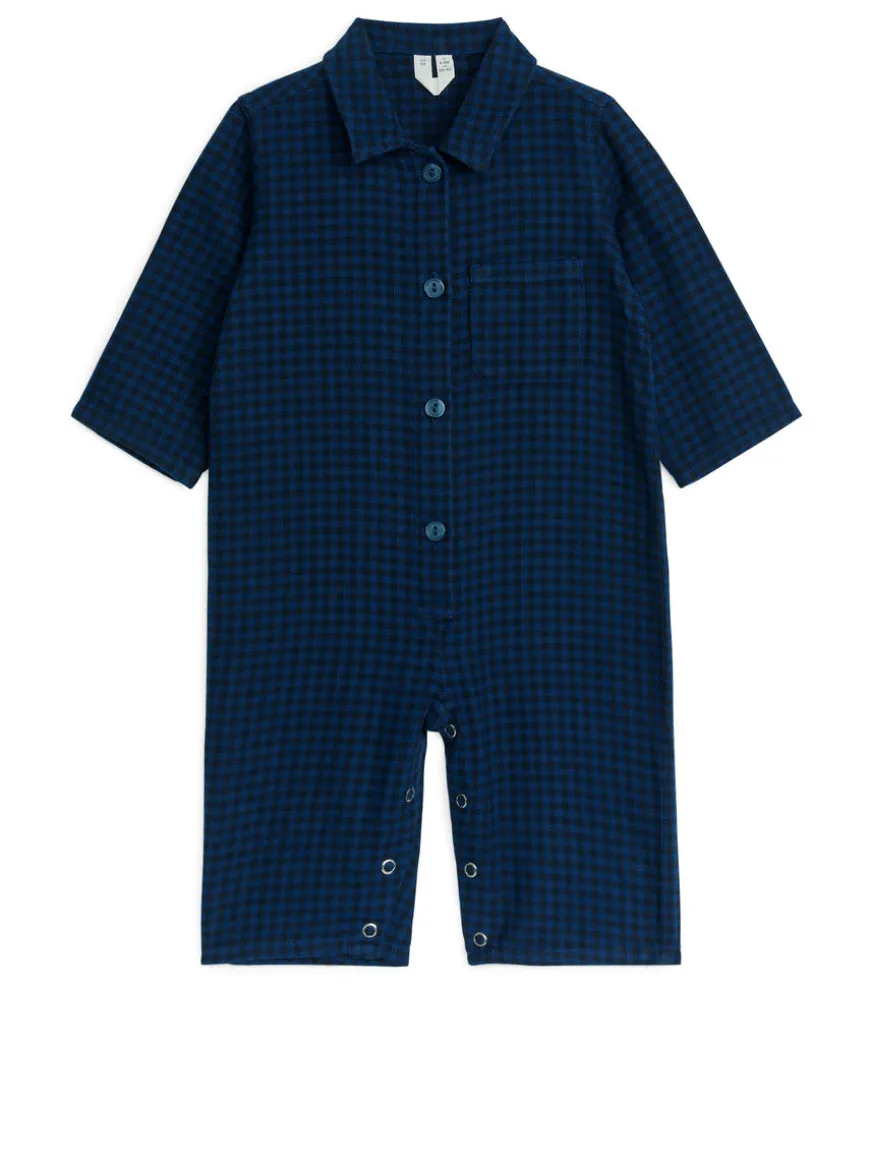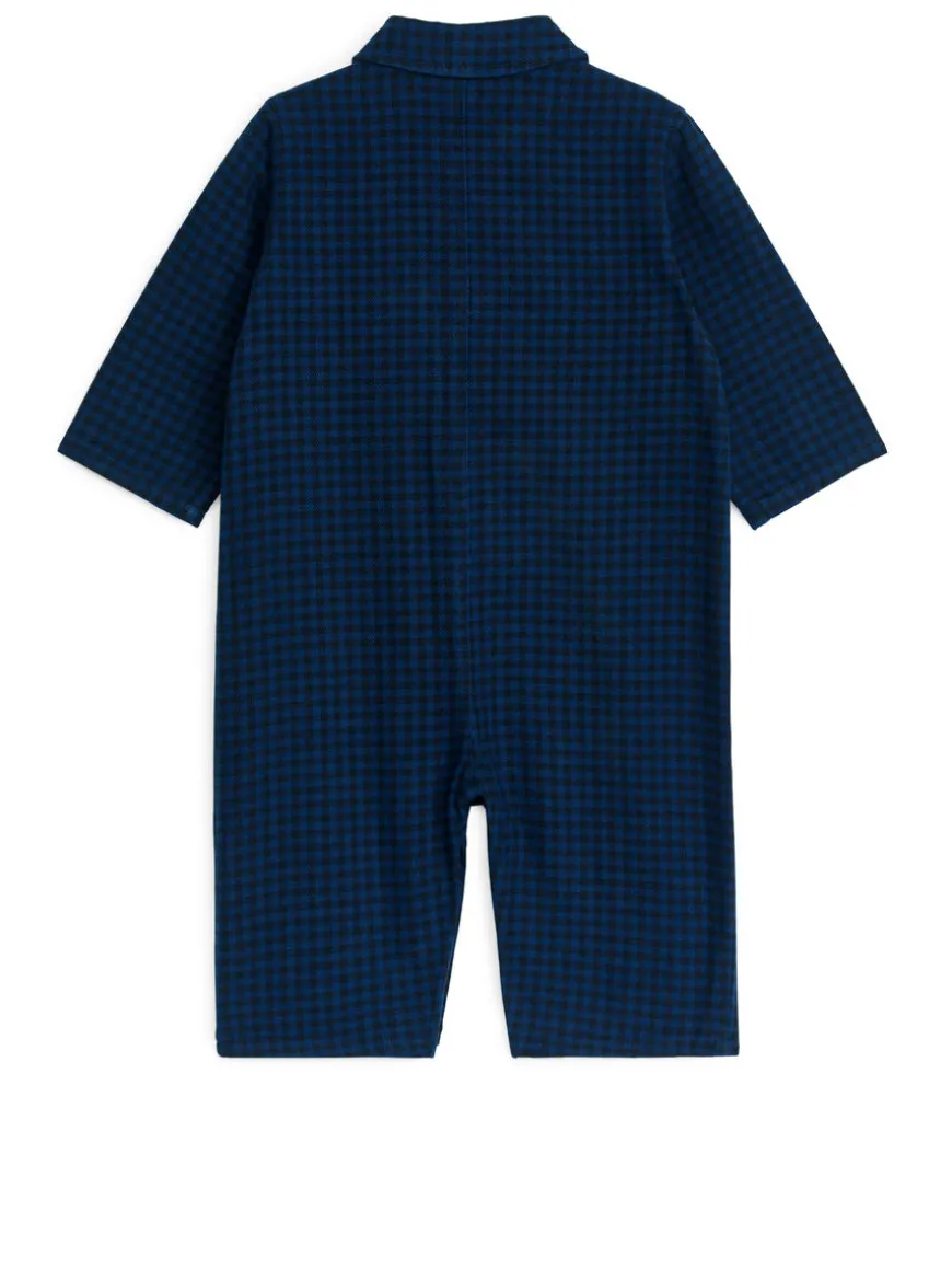 Long-sleeved jumpsuit crafted from a cotton flannel weave. Regular-fit style with shirt collar, chest pocket and button closure at front. Snap buttons in crotch for sizes 62-80.