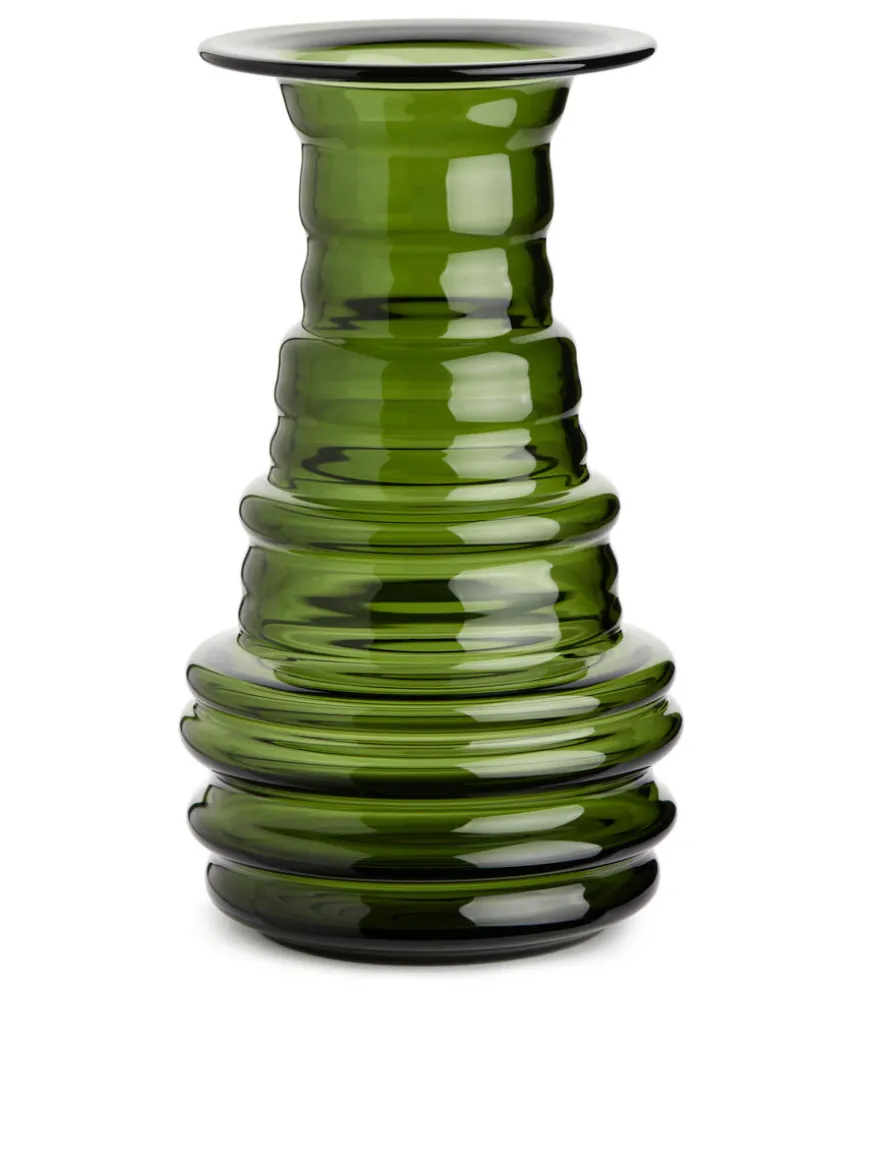 Large glass vase with a curvy shape and a brim at the top. Height 24.5 cm, width 12.7 cm.