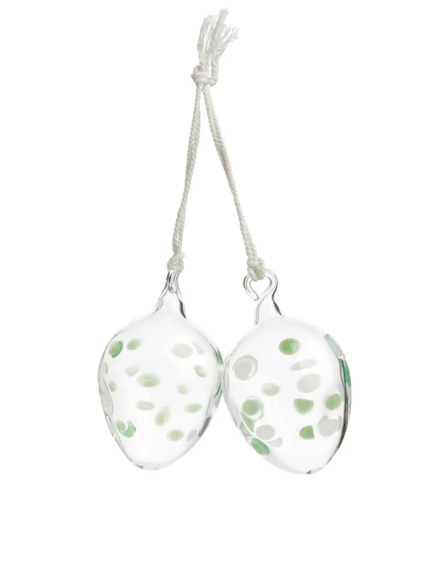 Delicate hanging ornaments made from clear glass with a pattern of coloured dots. Each piece has a unique finish. String attached for easy hanging. Sold in set of two pieces. Dimensions 6 cm x 4.3 cm.