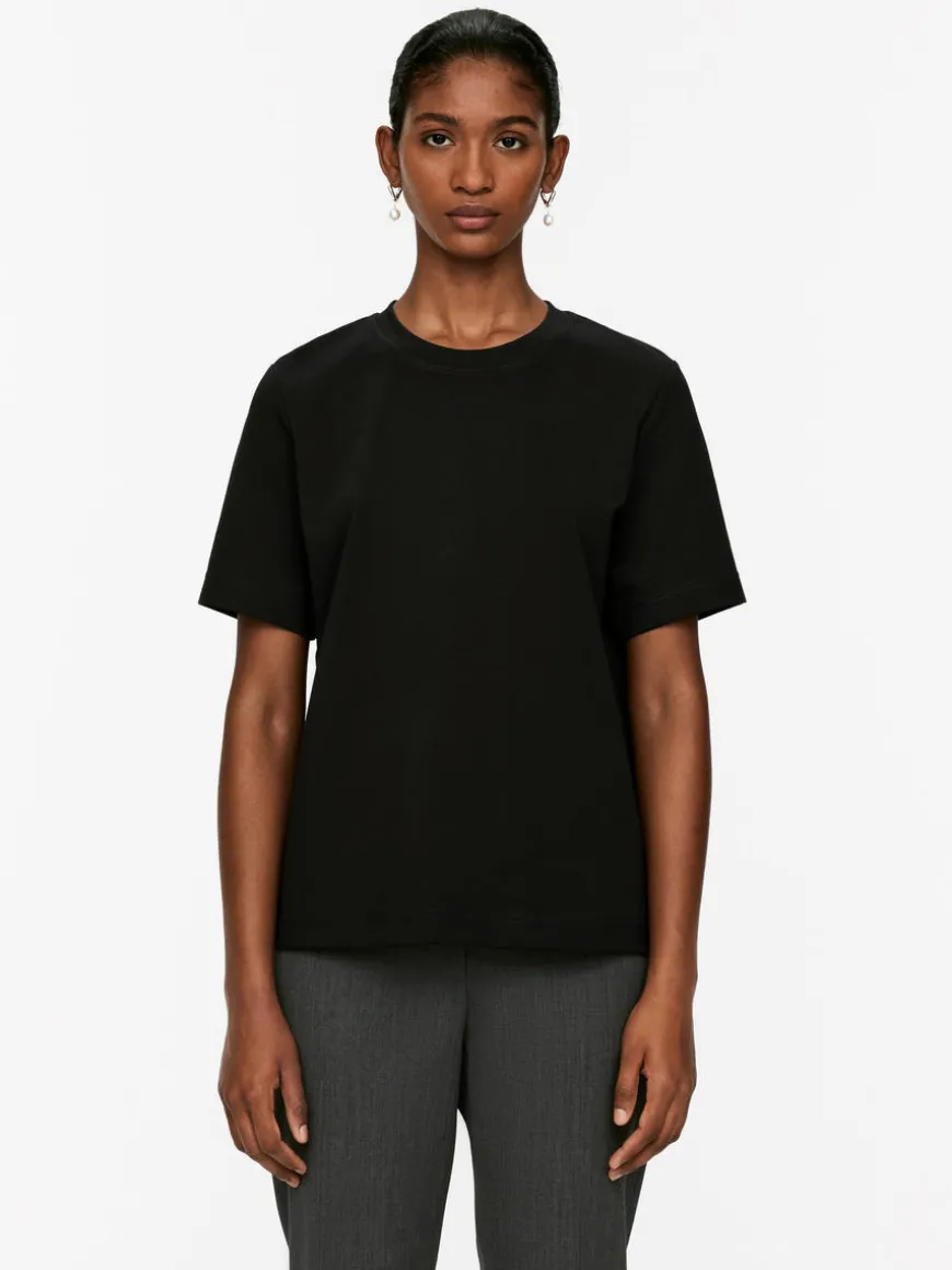 T-shirt cut from a heavy single jersey cotton knit. The sturdy but soft feel gives a smart look that stays in shape. A short-sleeved style with a round neckline and classic fit.