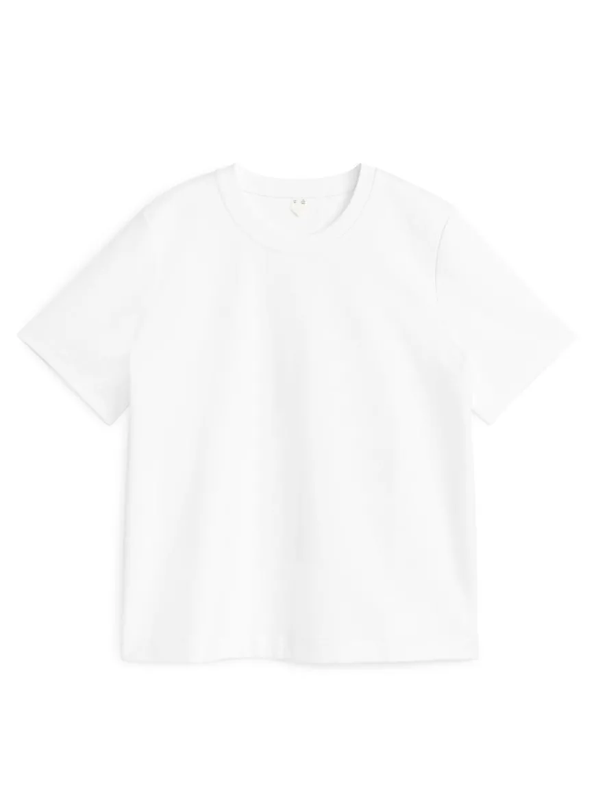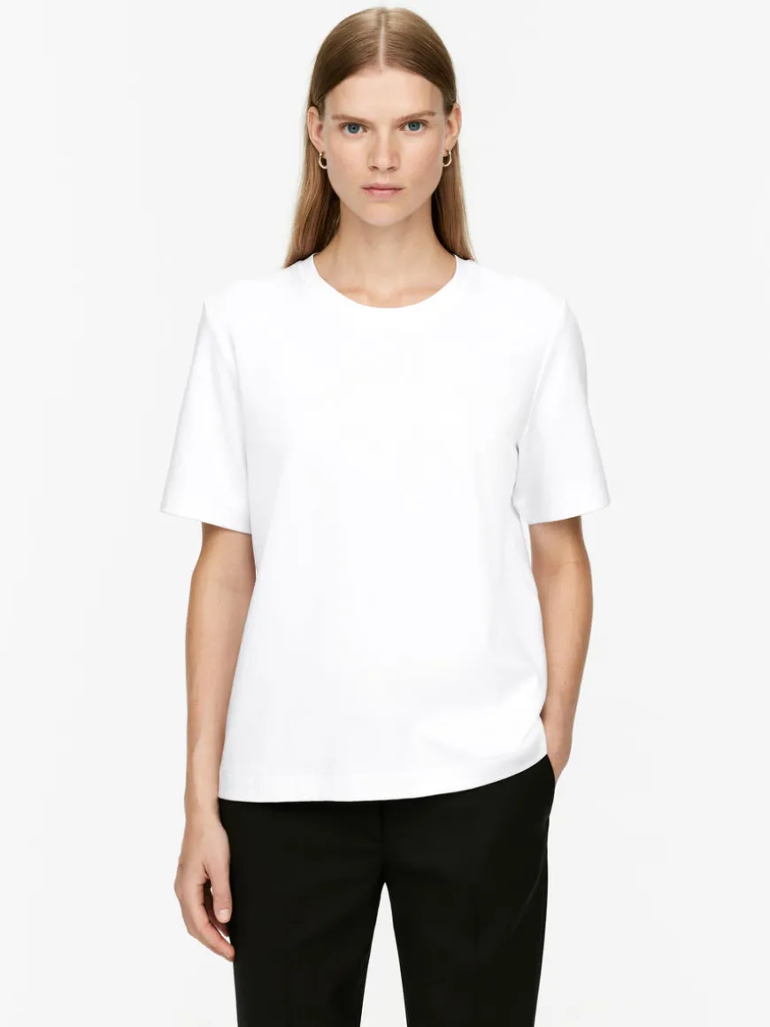 T-shirt cut from a heavy single jersey cotton knit. The sturdy but soft feel gives a smart look that stays in shape. A short-sleeved style with a round neckline and classic fit.