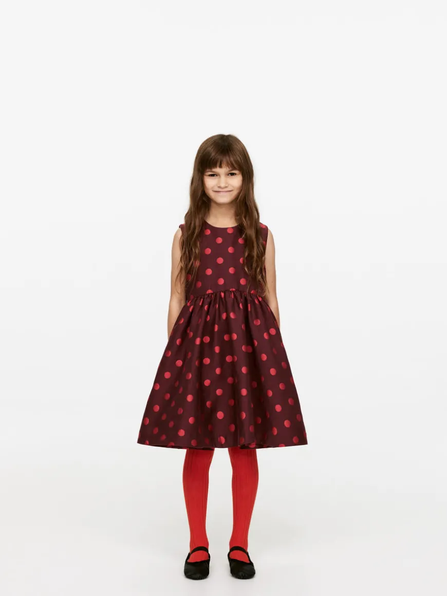 Dress featuring a jacquard-woven pattern. Styled with a curved waistline and gathers from waistline down. Hidden zip at centre ack. Top part is lined.