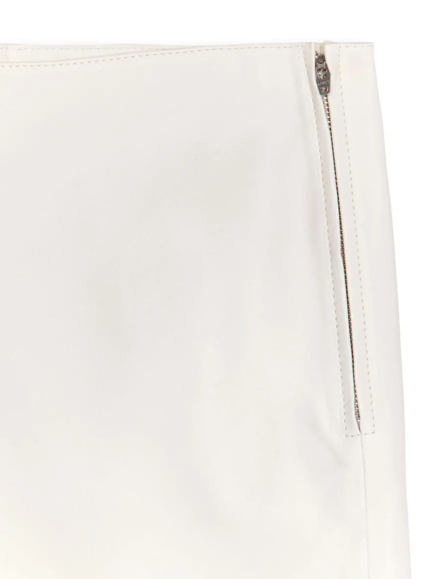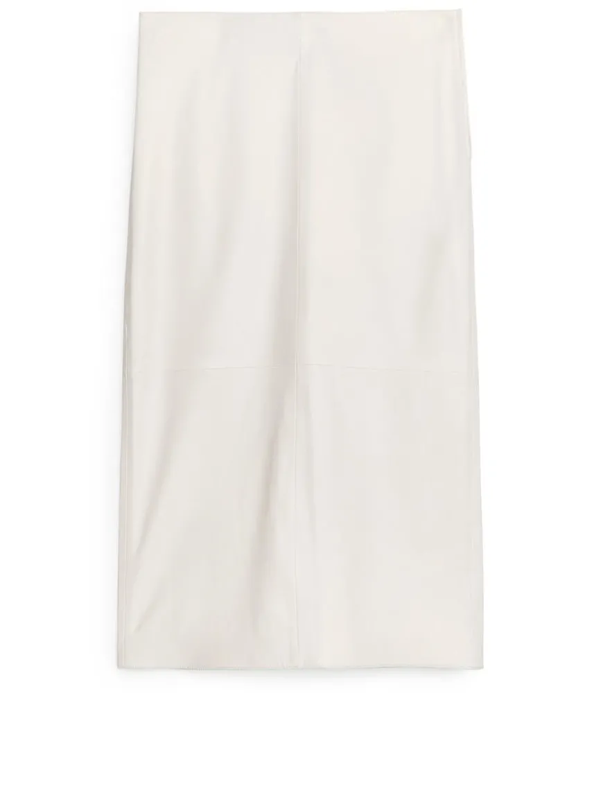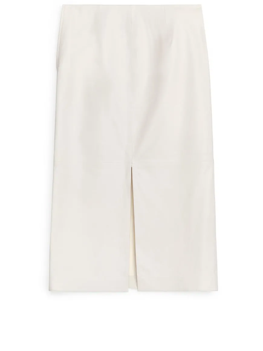 Mid-length leather skirt with a straight, slim fit. Styled with zip at side seam and slit at centre back.