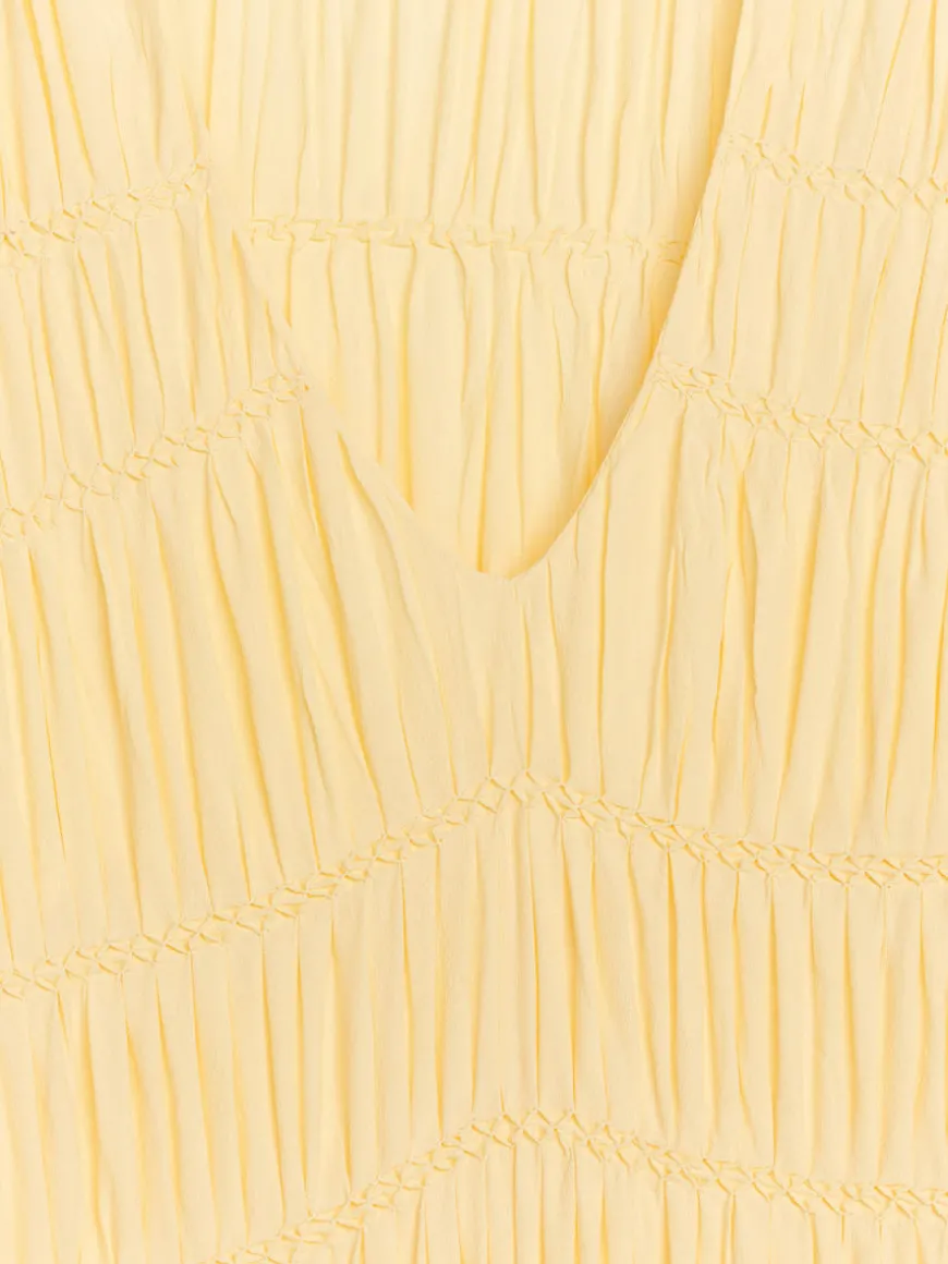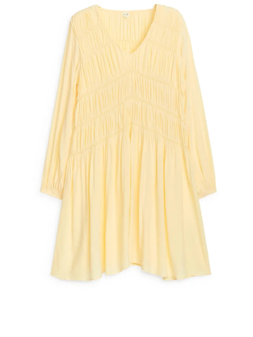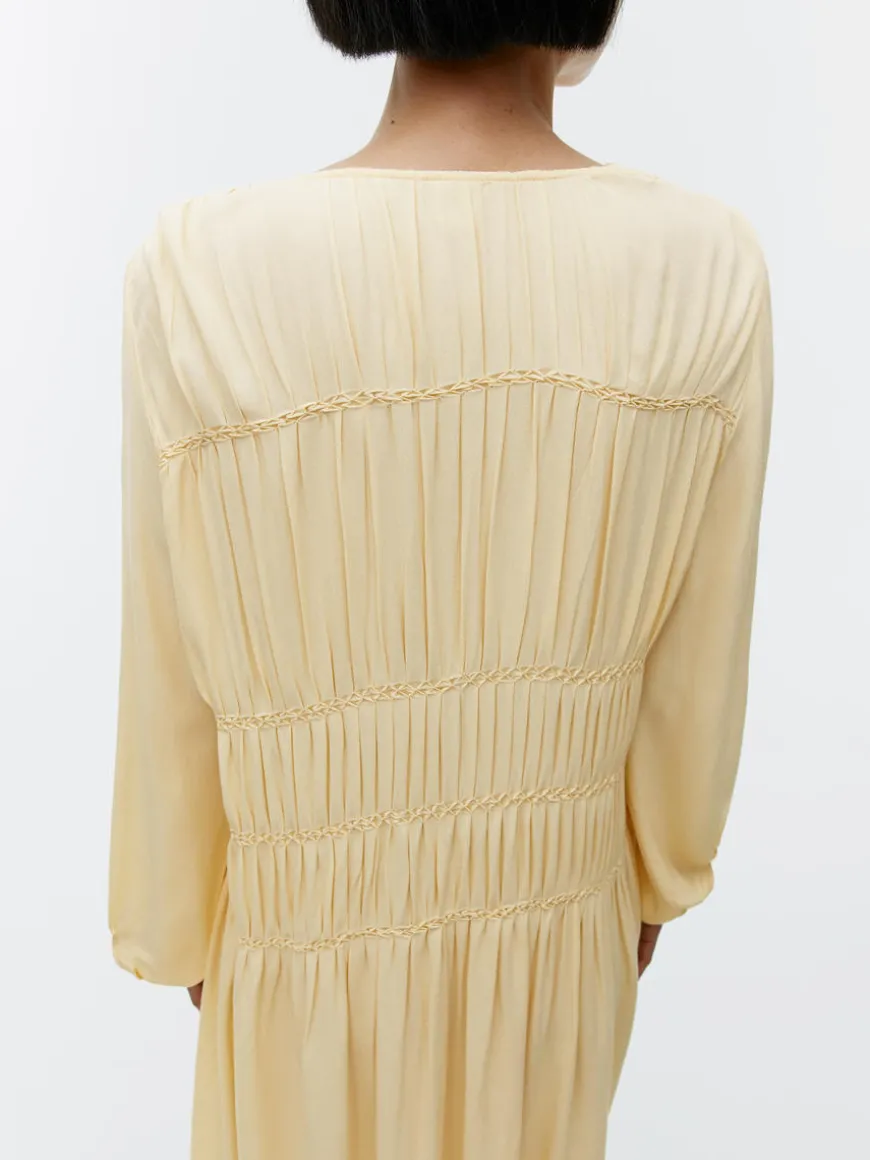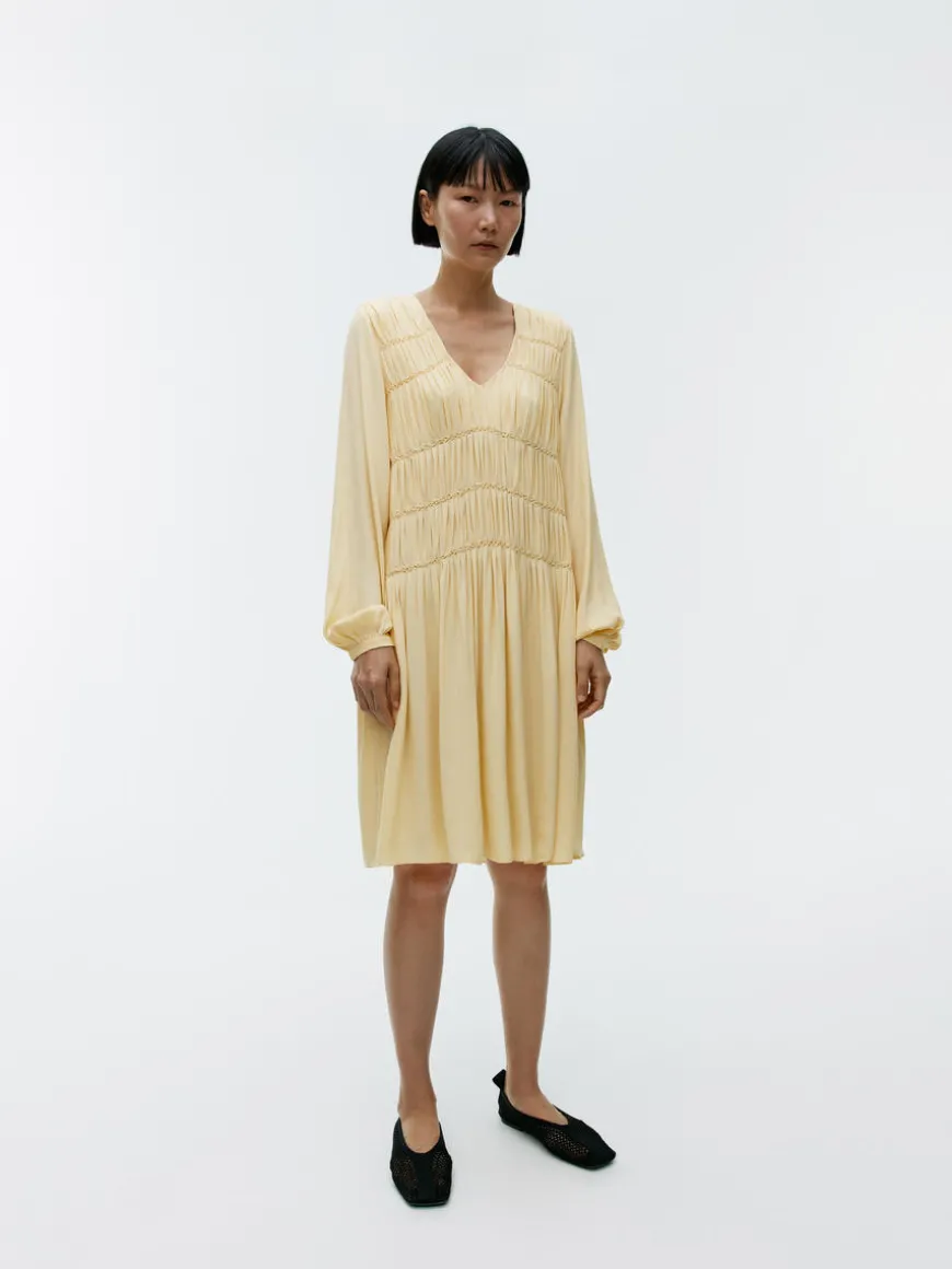 Midi dress made from a fluid viscose fabric. Features a V-neckline, balloon-shaped sleeves and smock details with elastic seams across the body. Pin hem at bottom edge.