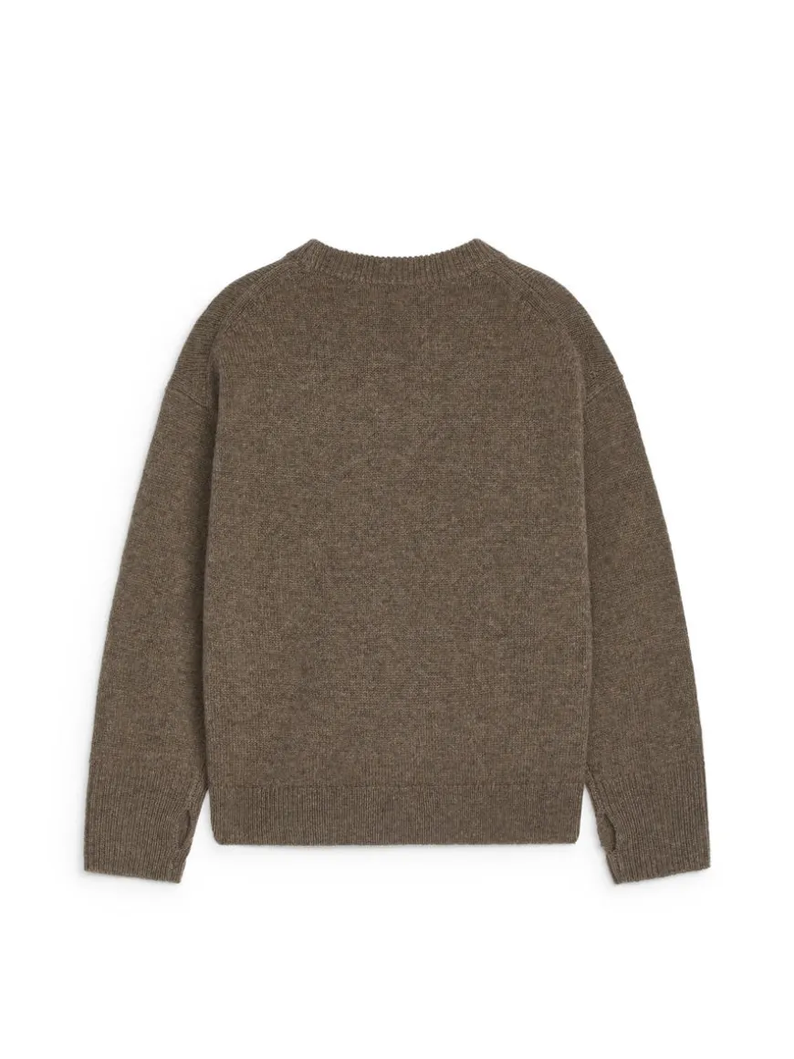 Jumper knitted from pure wool. Styled with a ribbed neck and cuffs. A relaxed fit with dropped shoulders, extra long sleeves with thumb hole. The jumper is made from 100% NATIVARegen™ wool certified by the NATIVA™ Protocol. The certification includes animal welfare, land and environment management and corporate social responsibility.