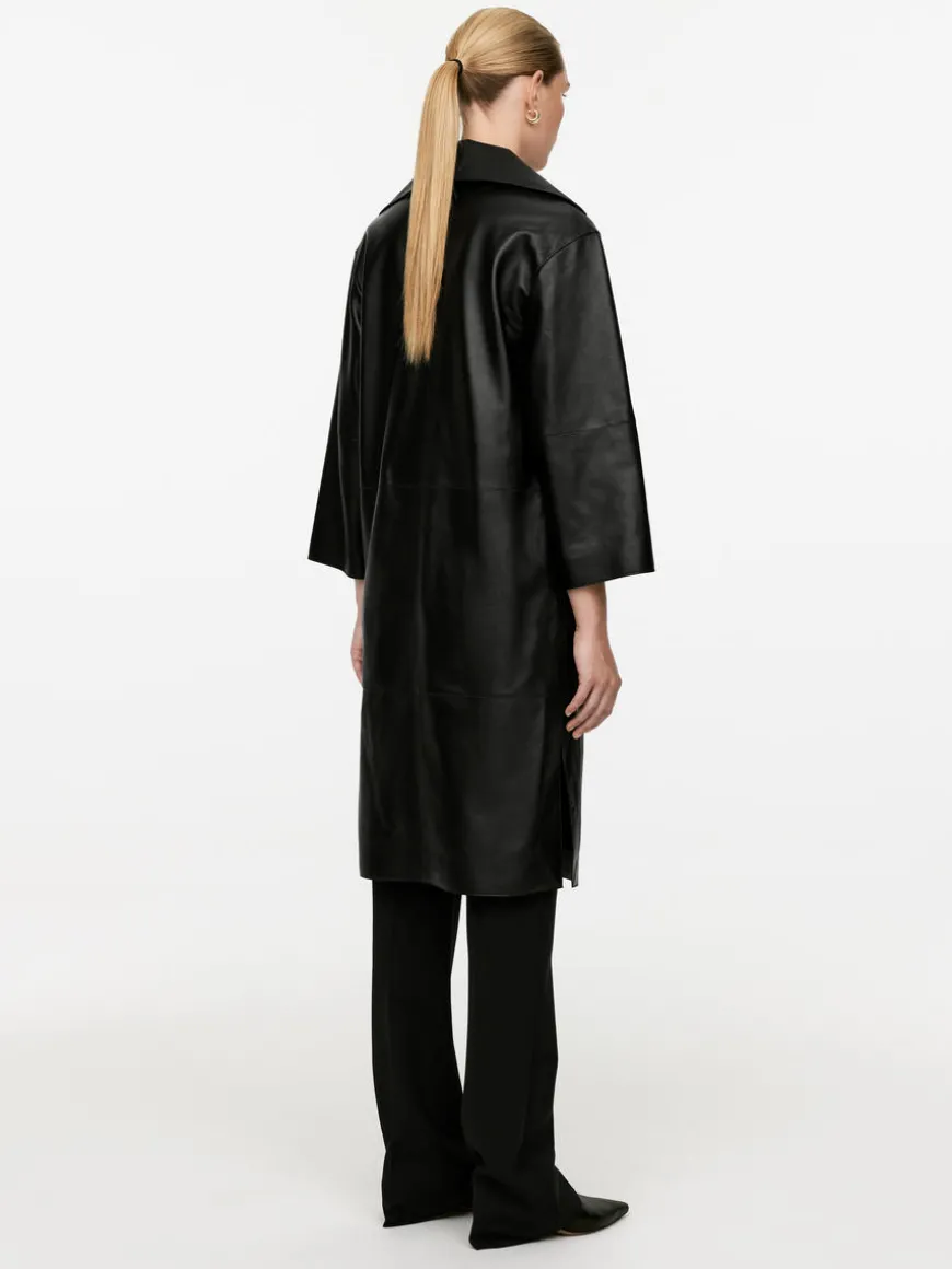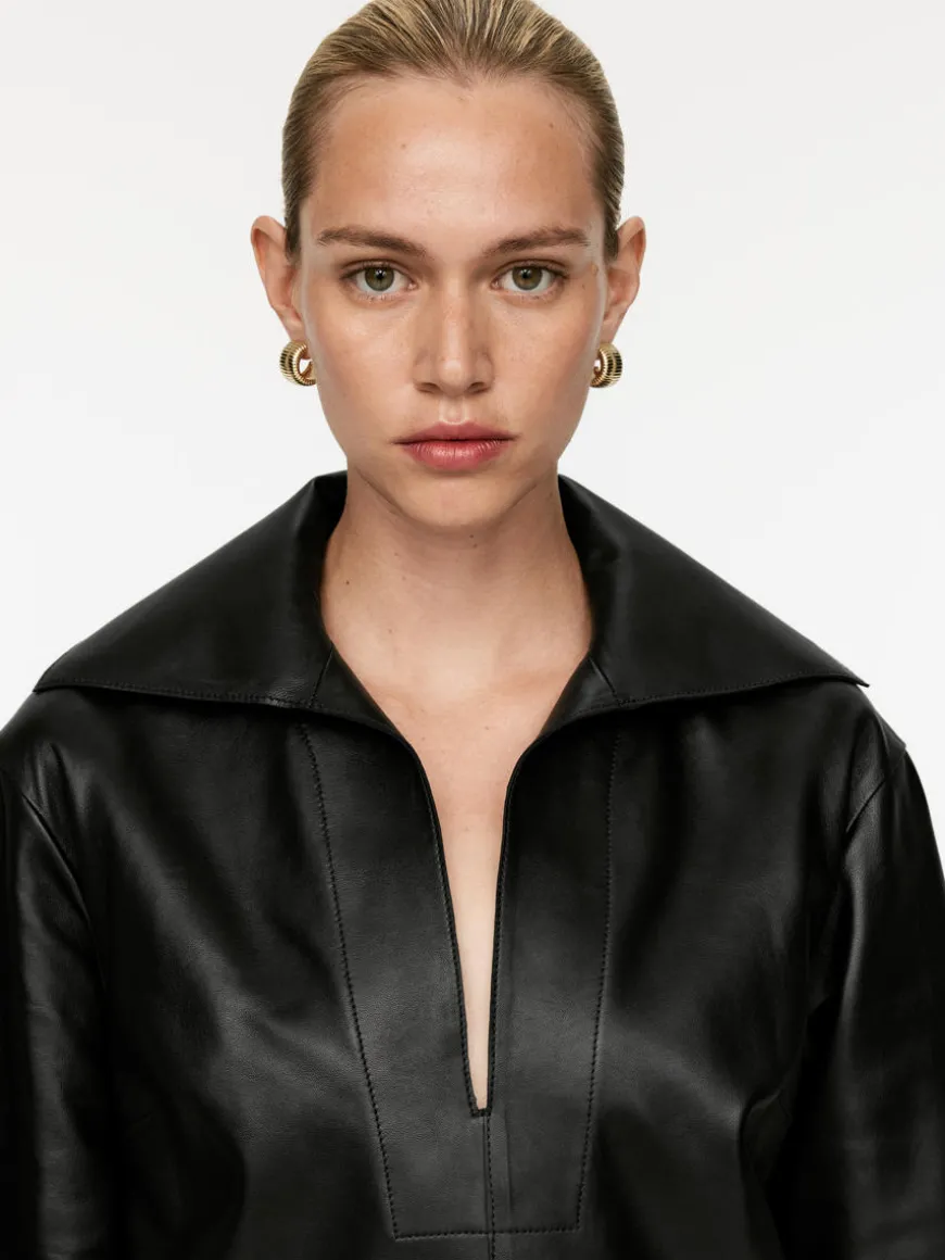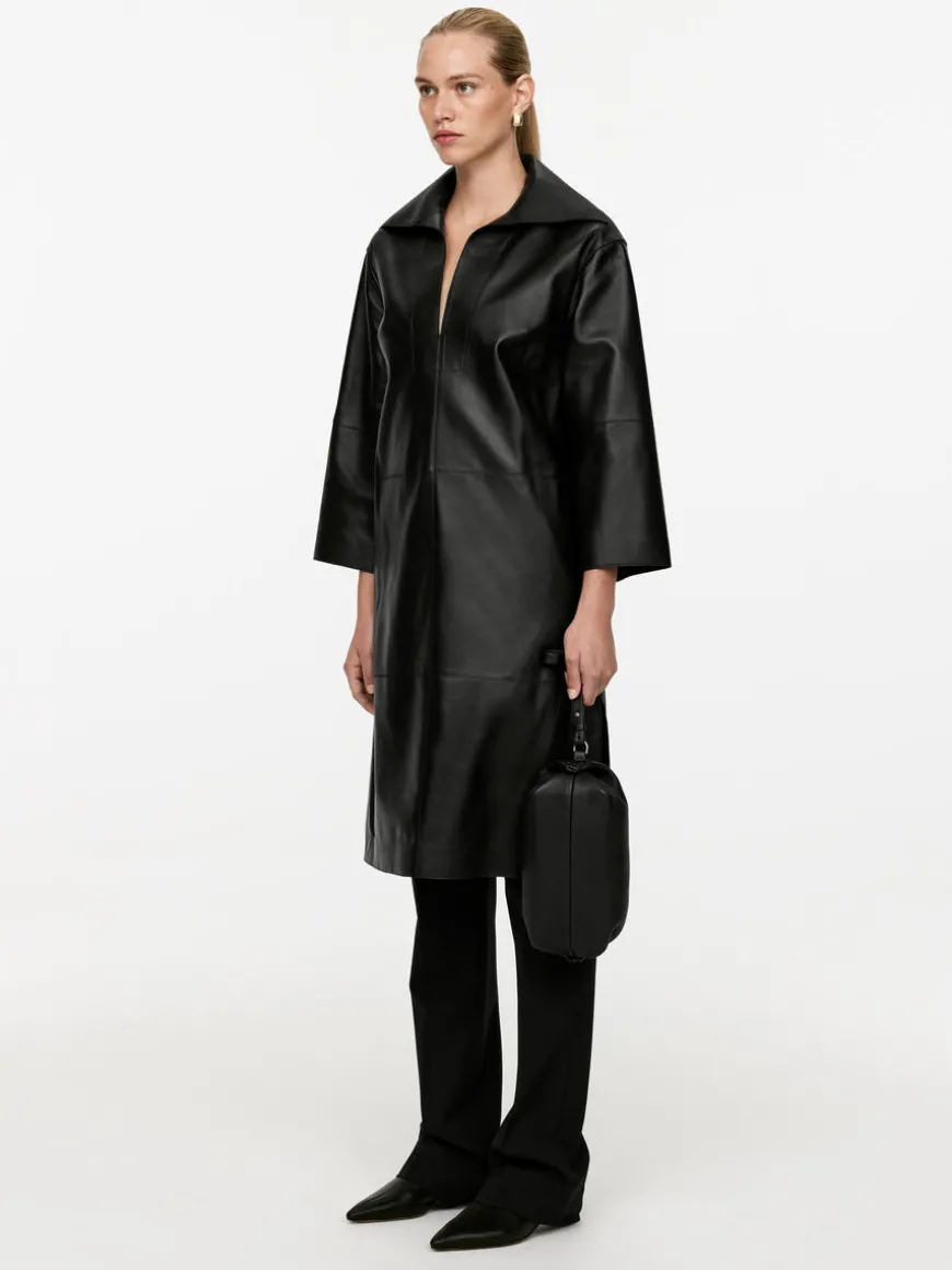 Leather dress or tunic featuring an open collar with wide lapel and straight-cut sleeves. Designed for a regular fit at body and cut to fall at mid calf length. Raw finish detailing with edge stitching. Slit at sides.