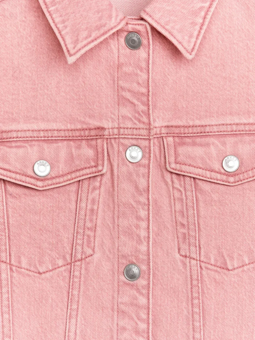 Oversized denim jacket with slightly dropped shoulders. Snap button closure. Chest pockets with flaps.