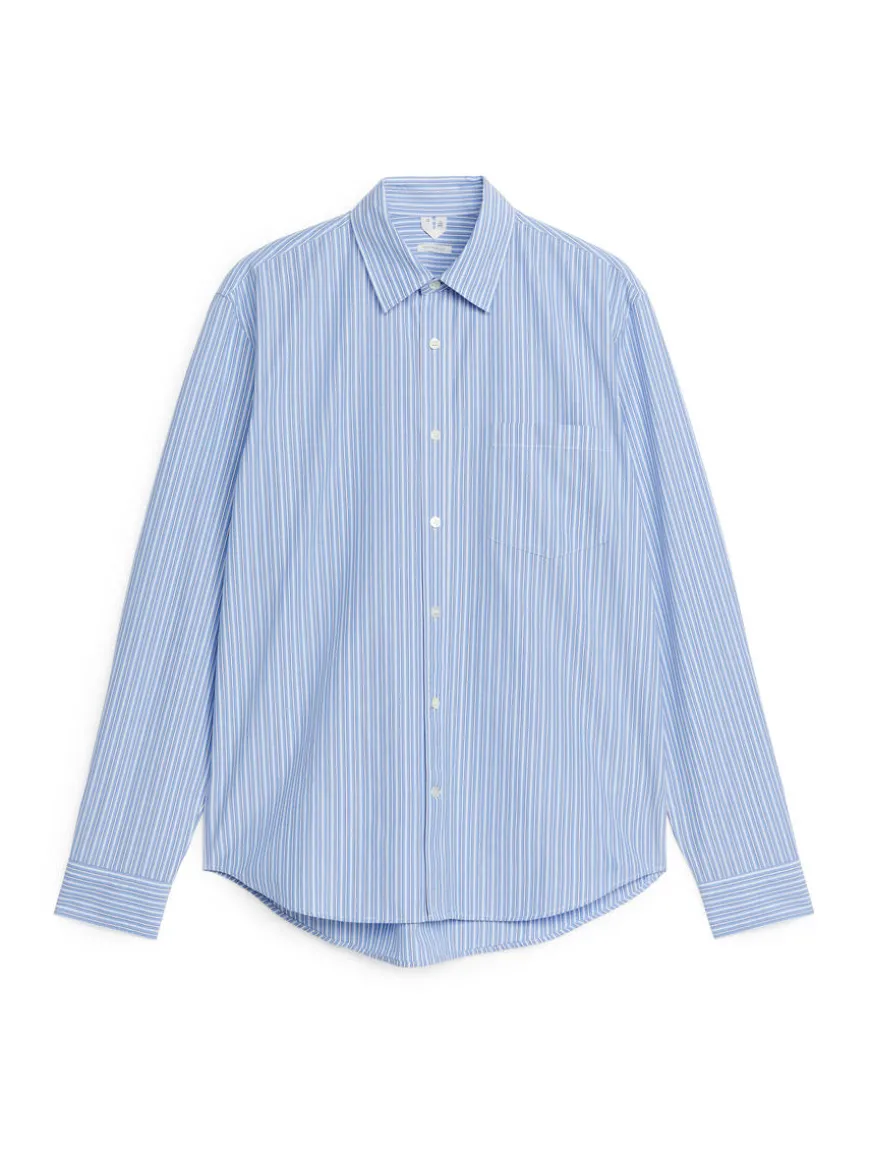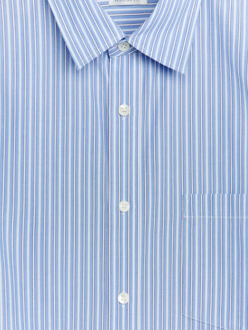 Shirt crafted from a crisp cotton poplin. Cut for a regular fit, styled with a regular collar and a single chest pocket. Buttoned cuffs. Curved hemline. Mother of pearl buttons, which means that this product contains material from animal origin.