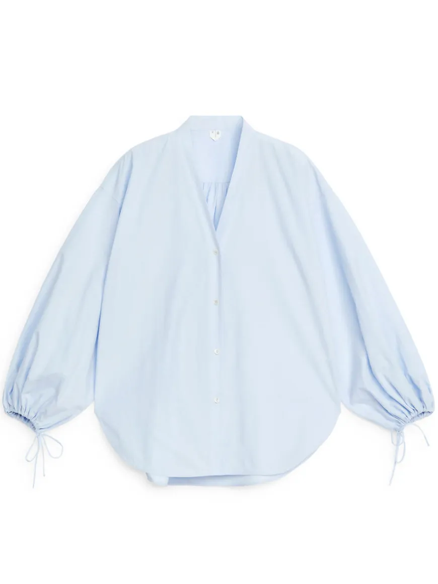 Blouse crafted from cotton with puffy sleeves ending in drawstring cuffs. A loose-fitted style with gatherings at the back and front buttoning.