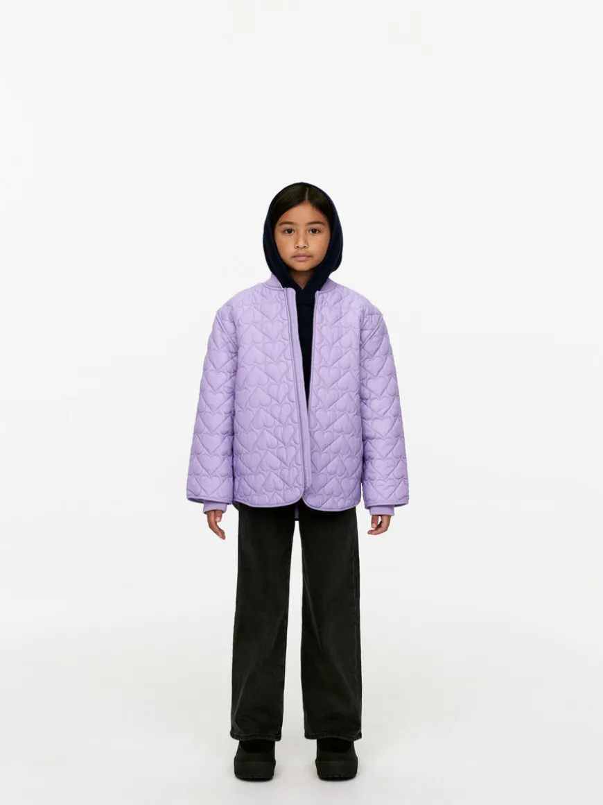 Padded jacket with a heart-shaped quilted pattern. Ribbed collar and ribbed cuffs inside sleeves. Pockets in side seams.