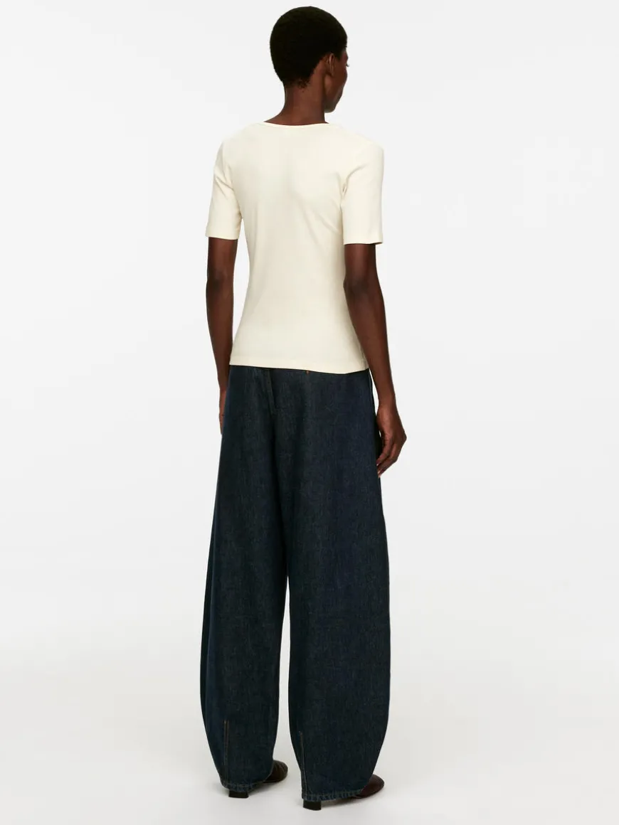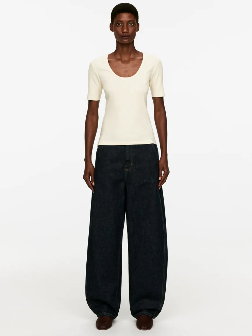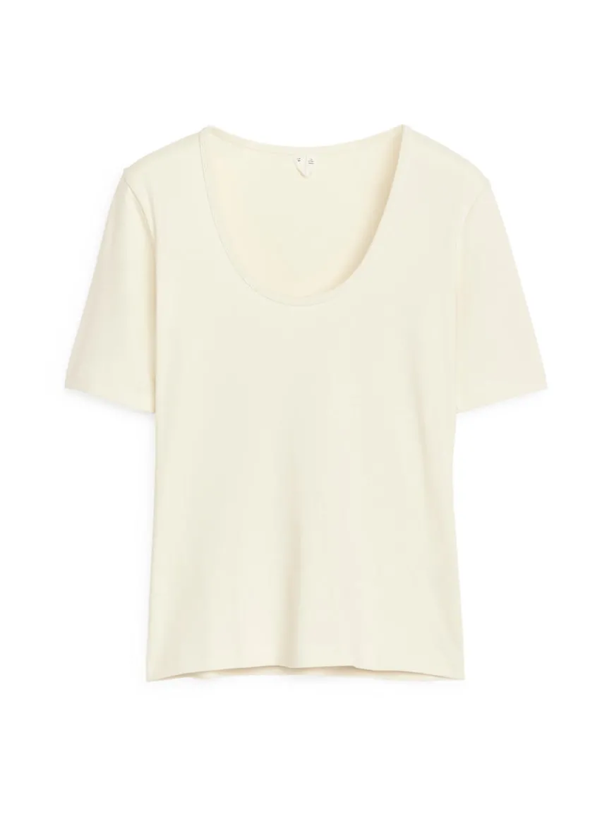 Ribbed T-shirt crafted from cotton. Styled with a scooped neckline and a slim fit.