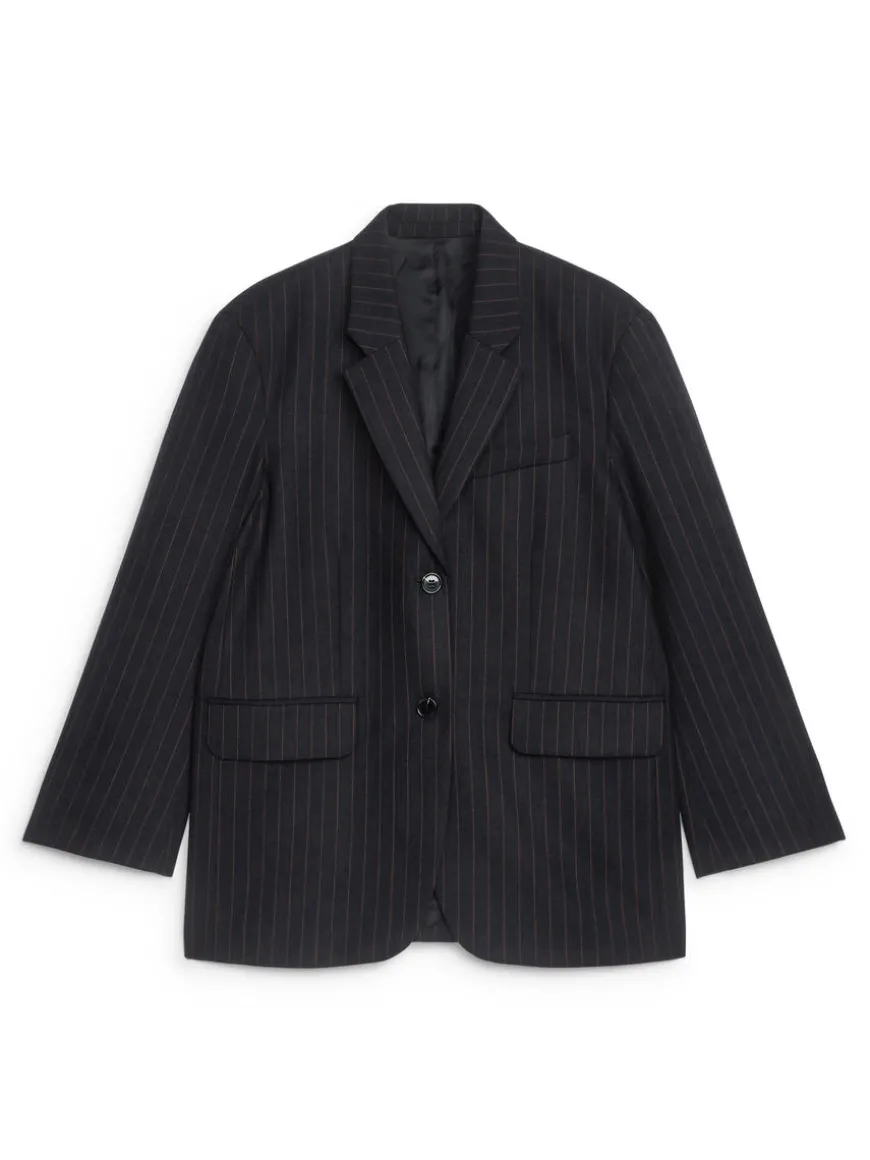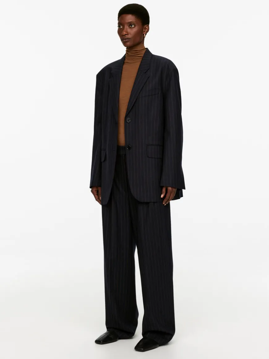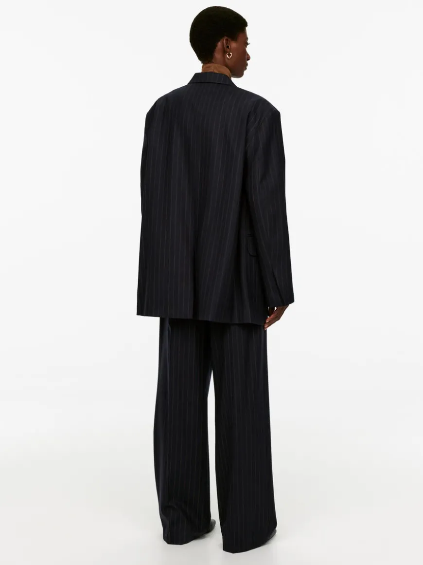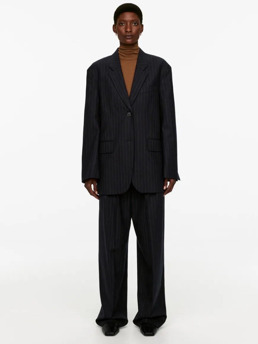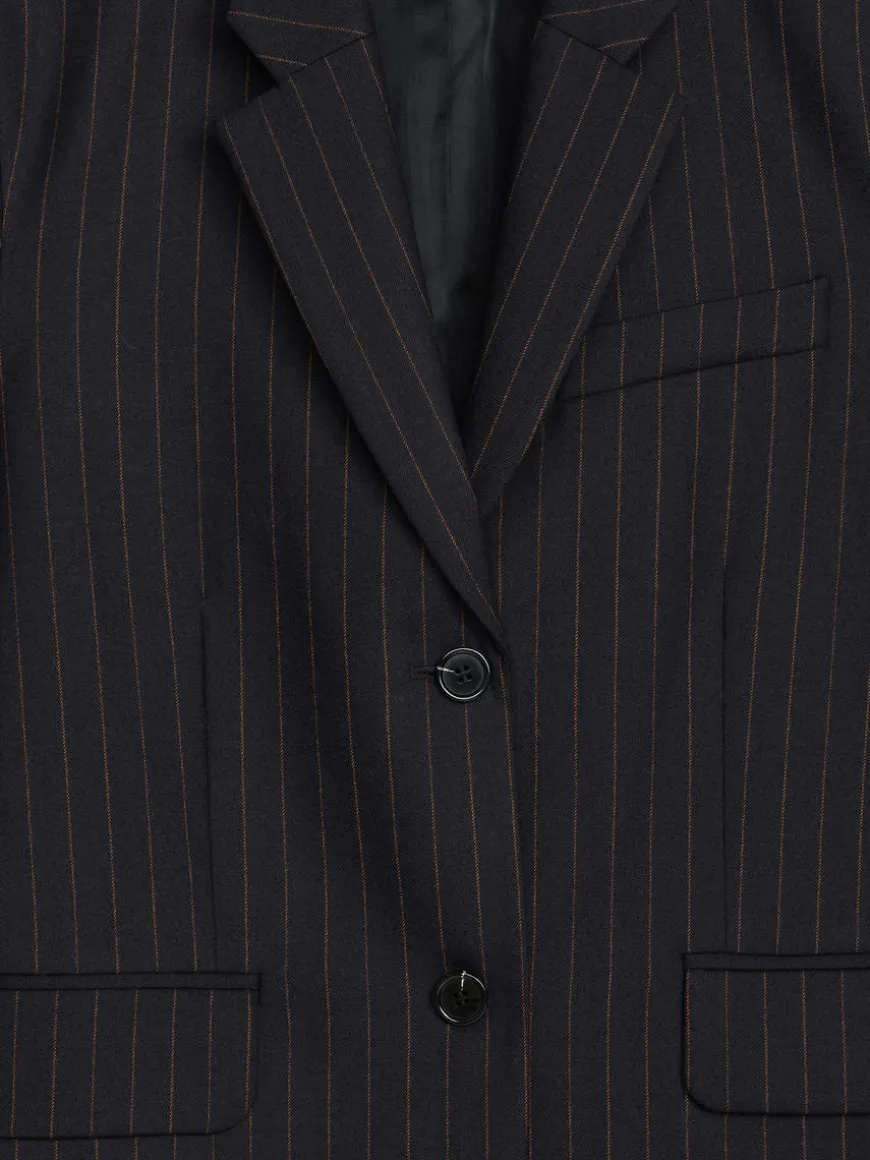 Single-breasted blazer with a relaxed fit and two-button closure. Single welt pocket at chest and welt pockets with flaps at front. Vent at back.