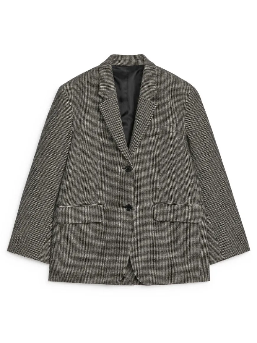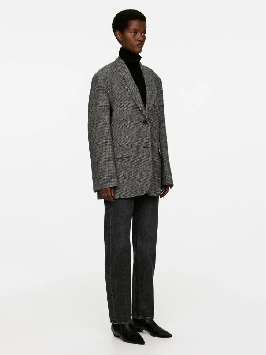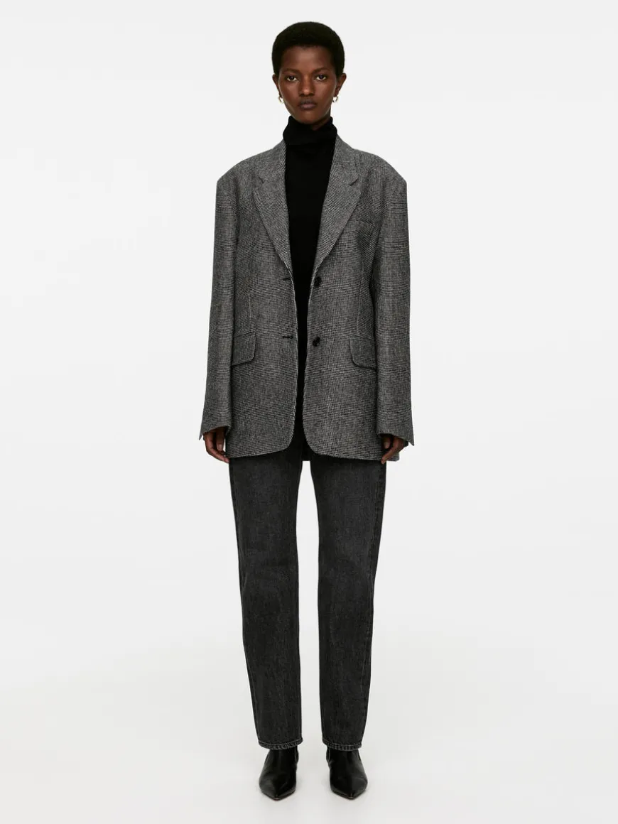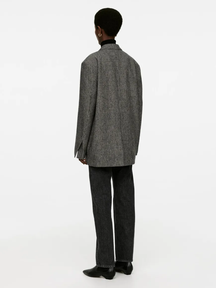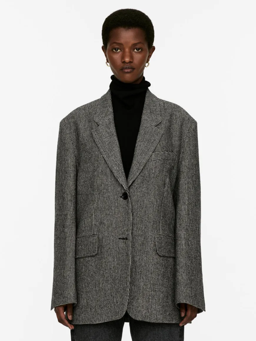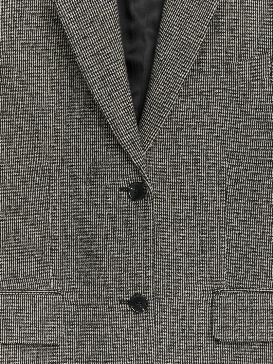 Single-breasted blazer with button closure. Styled with welt pockets with flaps at front and a single welt pocket at chest. Vent at back.