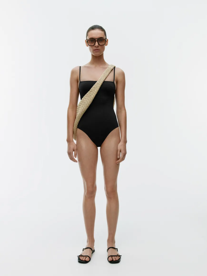 Swimsuit designed with a straight neckline in the front and a deep U-shaped back, slender adjustable straps and bust darts that ensure a smooth shape and a neat fit. Fully lined. High leg opening. Low support.