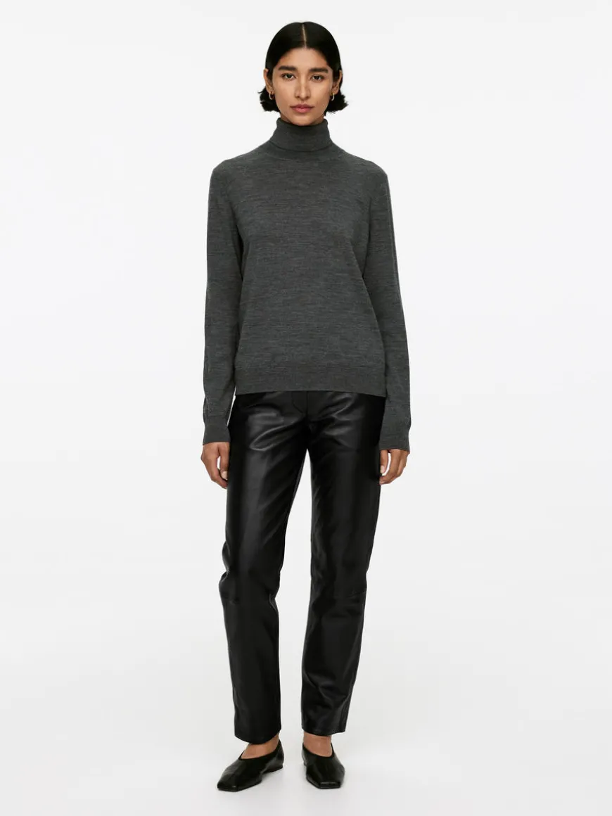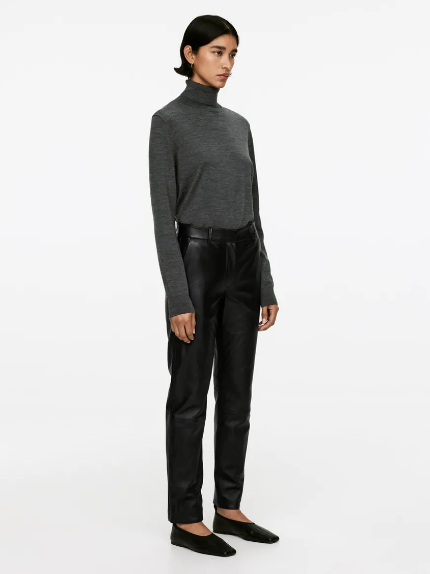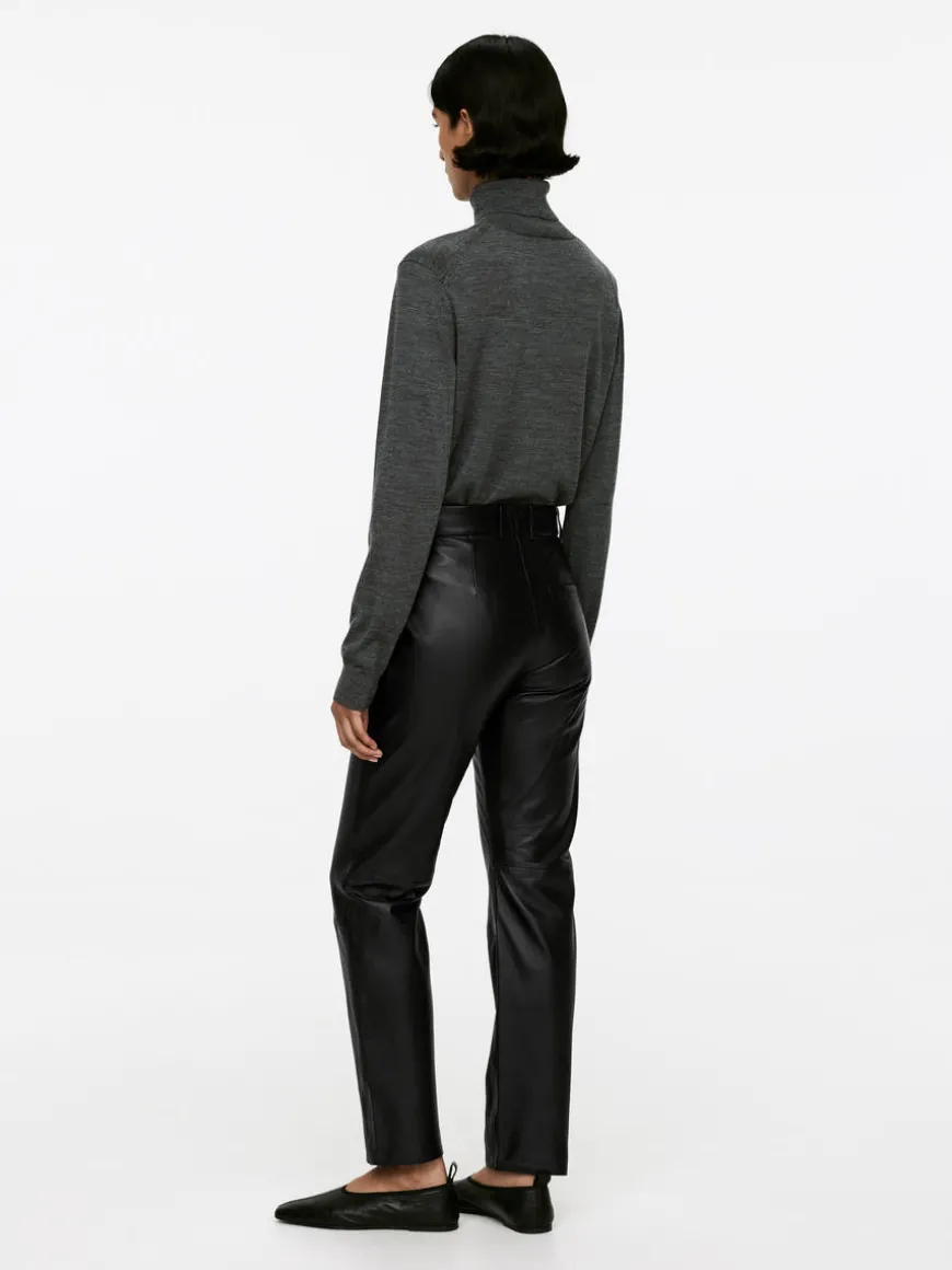 Leather trousers with straight legs and cut lines below the knee. Styled with hook-and-bar closure with zip, side pockets and a single back pocket.