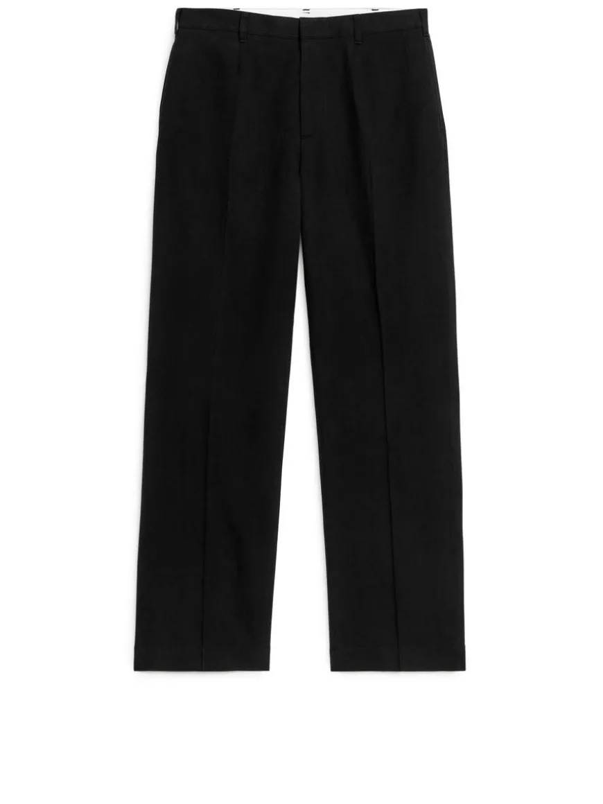 Tailored trousers with wide, straight legs. Styled with pockets at side seams and jetted back pockets with buttons. Button closure, zip fly.