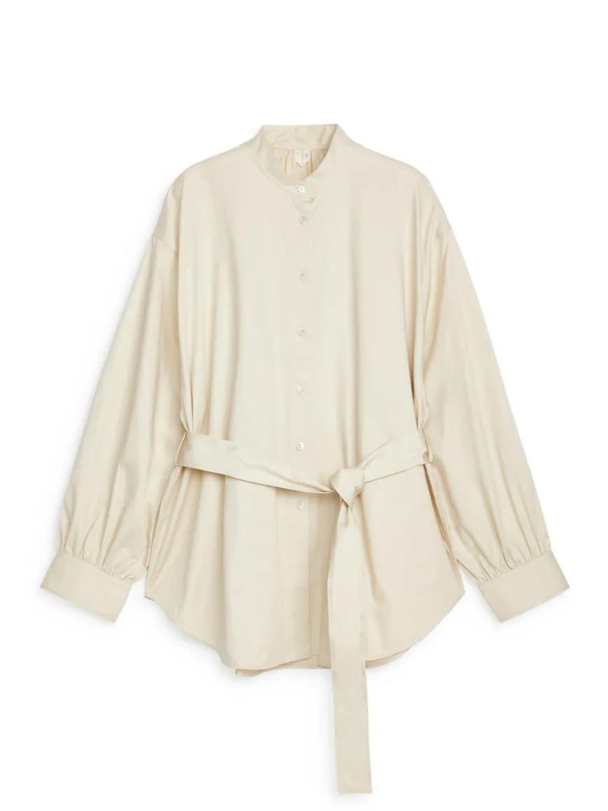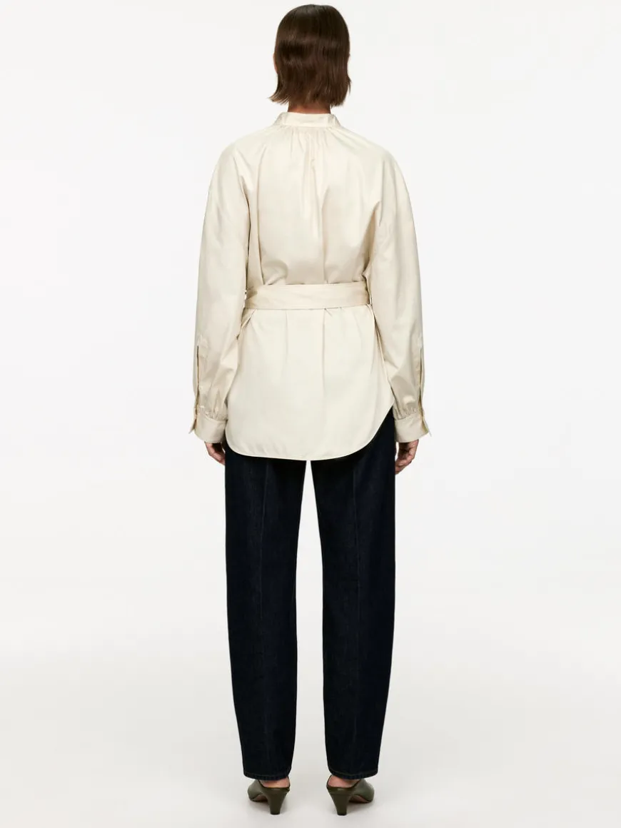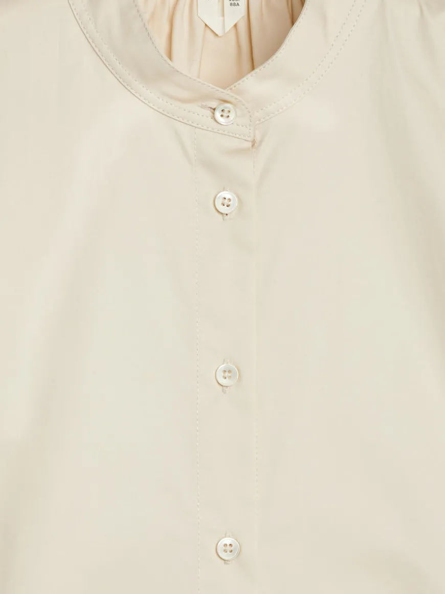 Cotton blouse with tie band at waist. Styled with standing collar and button closure. Regular fit.