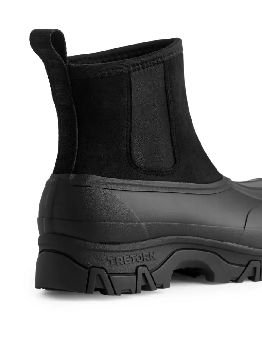 Ahus Hybrid from Tretorn is a robust and sturdy Chelsea boot. A classic duck boot style that is waterproof all the way to the top. Handmade from certified natural rubber. Quick dry and insulating lining. Pull tabs and elastic panels makes it easy to put on. Sturdy outsole pattern with high torsion strength and reinforced heel counter and toe cap. Removable molded EVA insole.