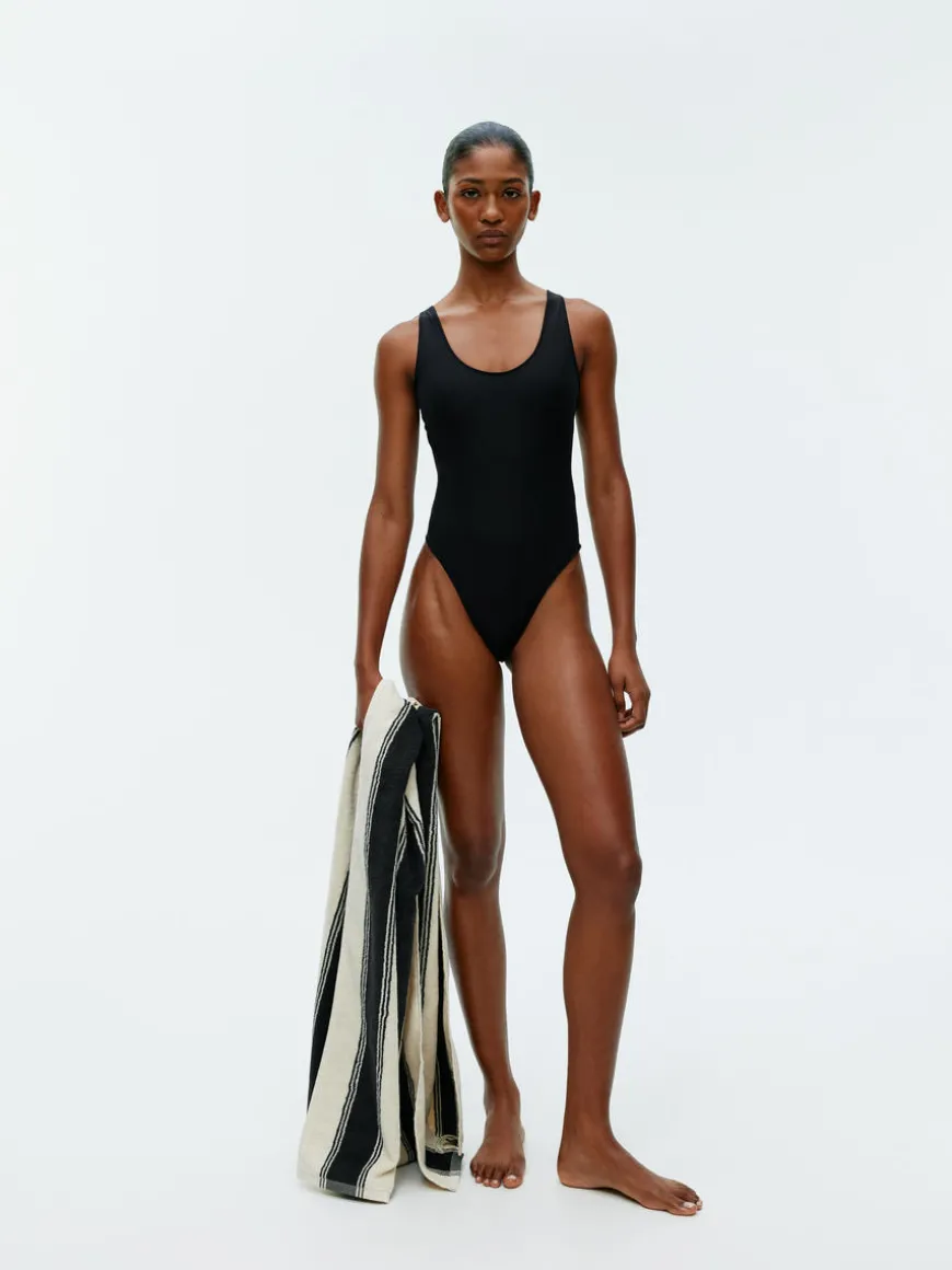 Swimsuit designed with a U-neck and a scooped back. High leg opening. Lined at front with removable pads.