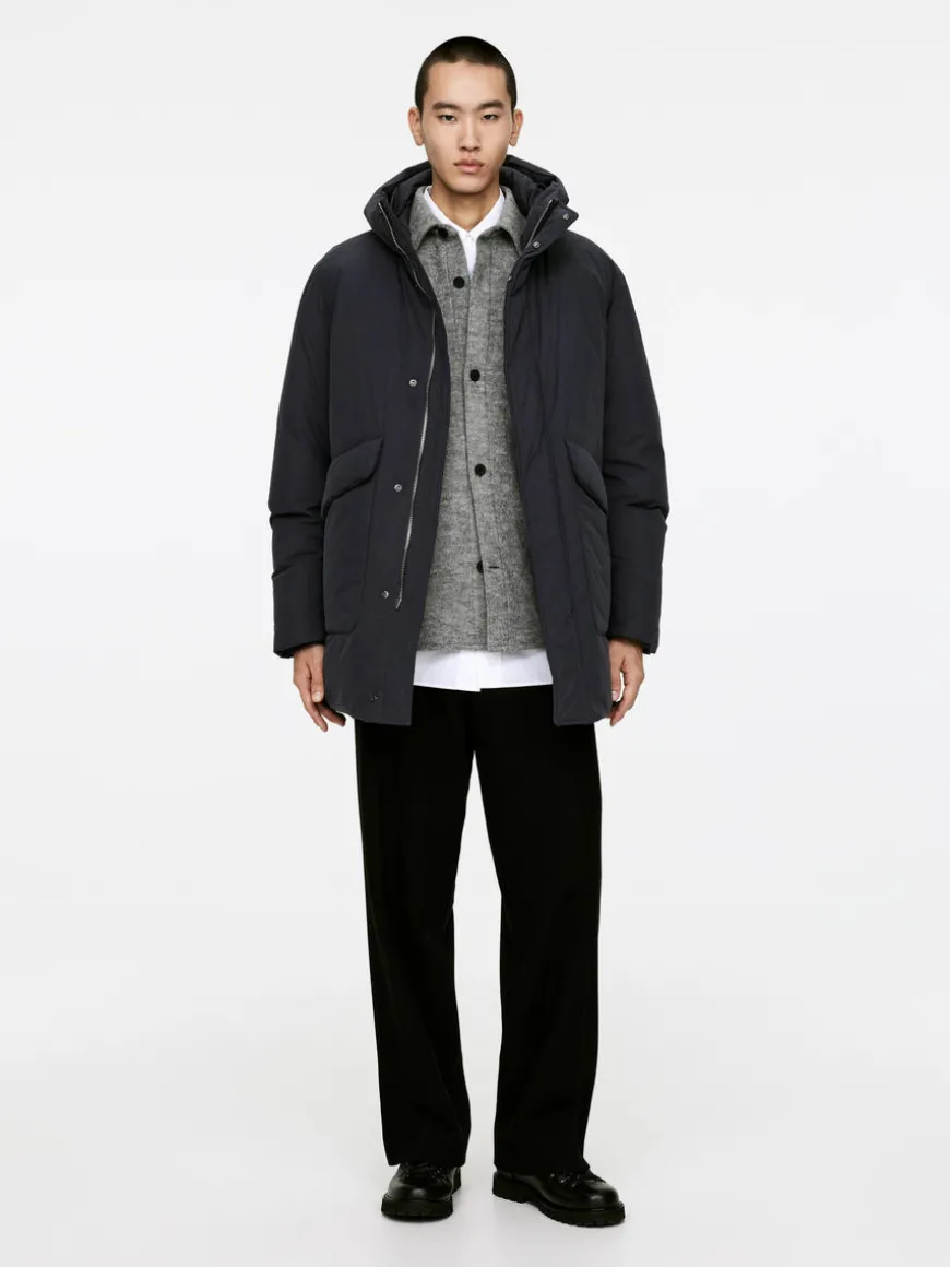 Hooded, mid-length jacket filled with a blend of down and feathers for cold resistance. Front placket with a two-way zip and hidden snap buttons, and large pockets with flaps and snap button closure. Two inner pockets. The Upcycled Down products are filled with recycled down and feathers sourced from Re:Down®. These materials, collected from used textiles, are washed and sterilised at high temperatures without the use of chemicals.