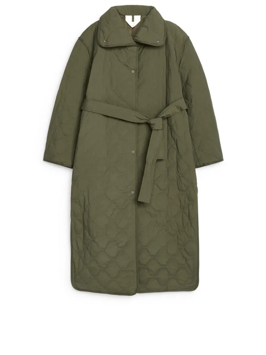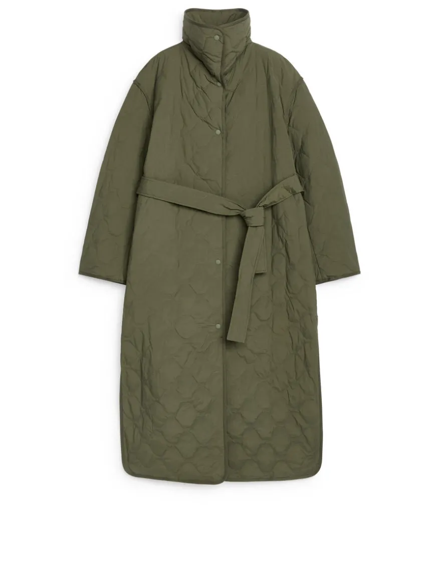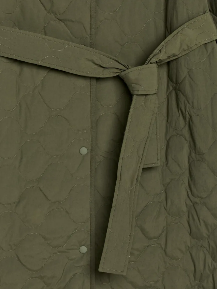 Quilted liner coat filled with a blend of down and feathers. A single-breasted, belted style with snap buttons, hidden side pockets and standing collar with button closure. Relaxed fit with dropped shoulders. Slit at sides. The Upcycled Down products are filled with recycled down and feathers sourced from Re:Down®. These materials, collected from used textiles, are washed and sterilised at high temperatures without the use of chemicals.
