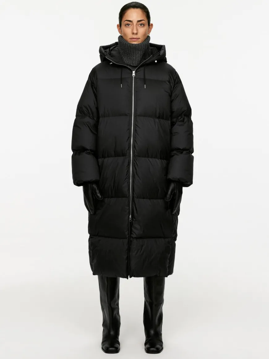Long coat filled with a blend of down and feathers. A hooded style with zip closure at front and hidden side slits with snap buttons. Side pockets with zip closure. The Upcycled Down products are filled with recycled down and feathers sourced from Re:Down®. These materials, collected from used textiles, are washed and sterilised at high temperatures without the use of chemicals.