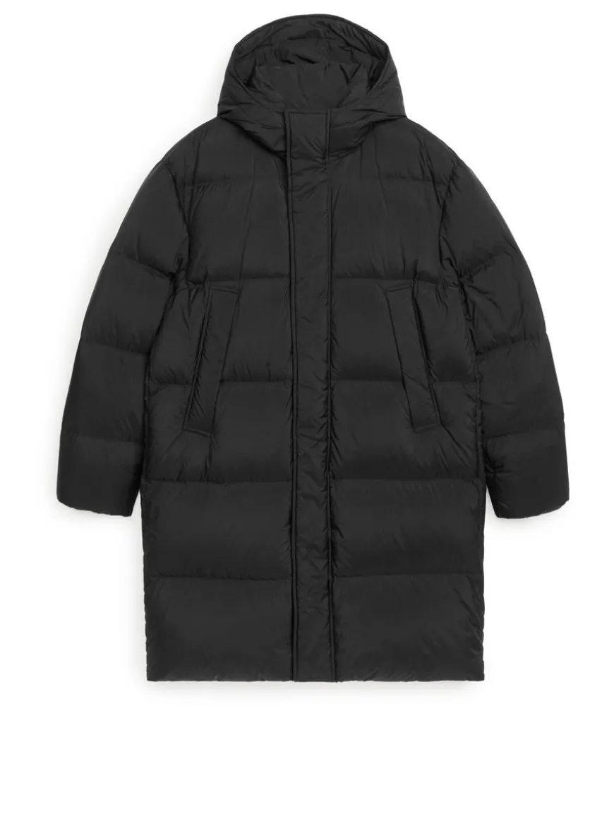 Quilted puffer with an elongated silhouette. This style features down and feather filling for excellent warmth and insulation in dry weather. A hooded style with a two-way zip front and a press-button placket for extra protection. Welt pockets with hidden snap buttons and two interior chest pockets. Elasticated cuffs. The Upcycled Down products are filled with recycled down and feathers sourced from Re:Down®. These materials, collected from used textiles, are washed and sterilised at high temperatures without the use of chemicals.