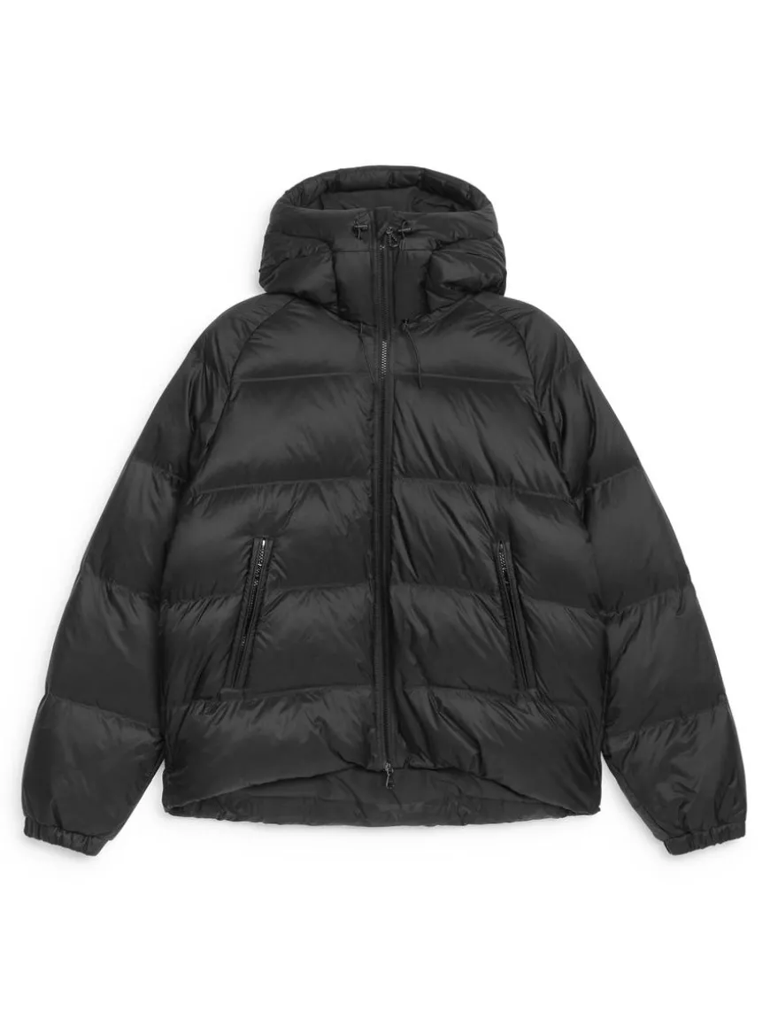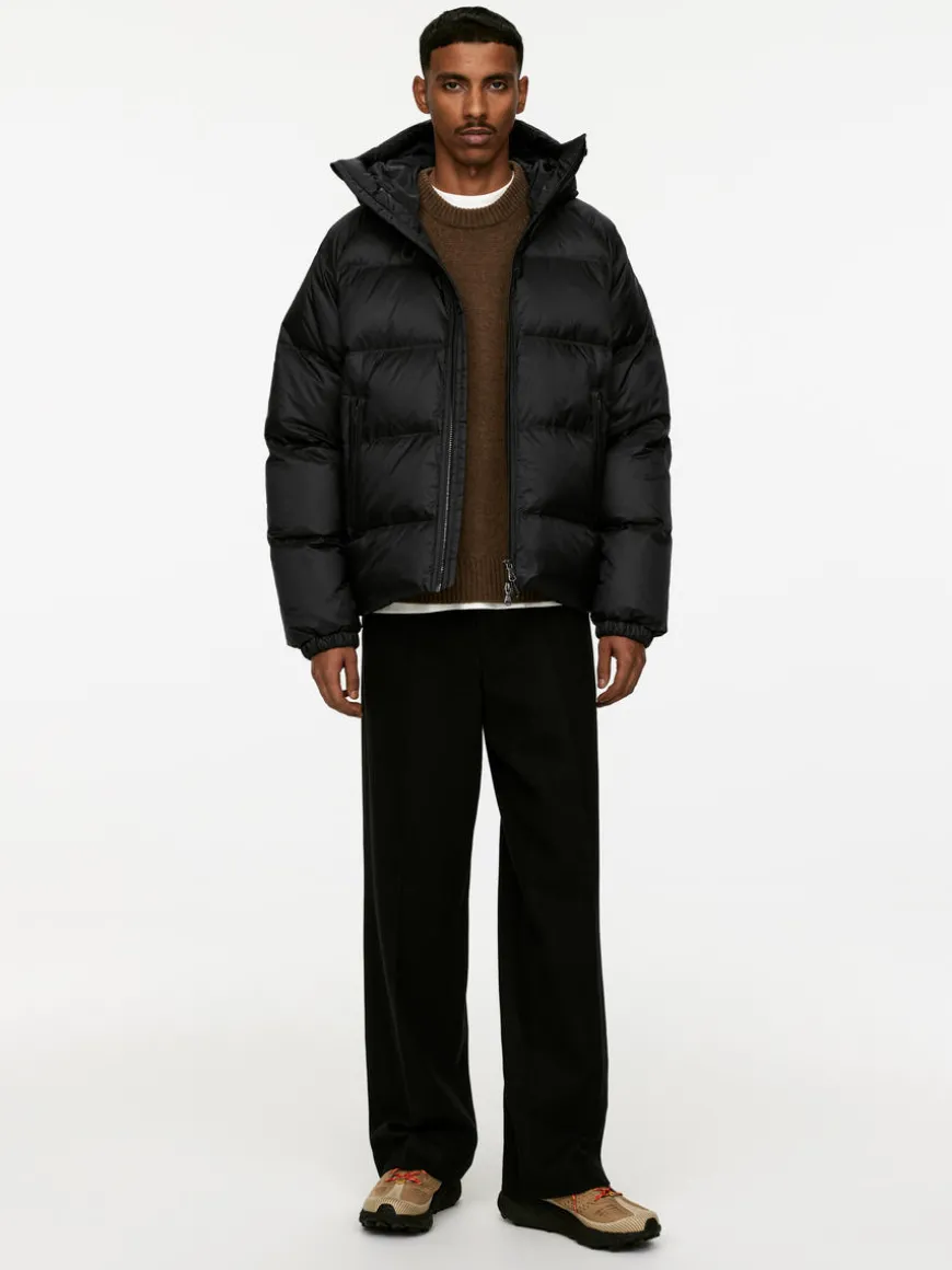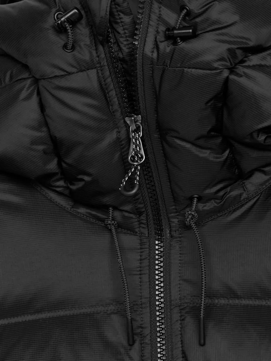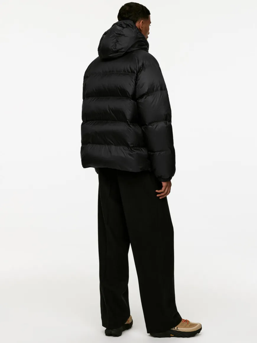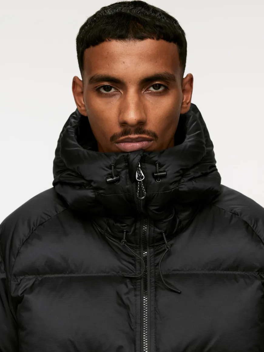 Sporty down jacket with a regular, puffy fit. Made with a polyester shell and filling made from a blend of feathers and down. Styled with a down-filled hood and double jetted pockets at front. Smart detailing include a two-way zip at front and elastics at cuffs, bottom hem (adjustable) and hood opening (adjustable). The Upcycled Down products are filled with recycled down and feathers sourced from Re:Down®. These materials, collected from used textiles, are washed and sterilised at high temperatures without the use of chemicals.