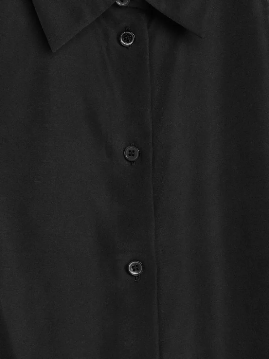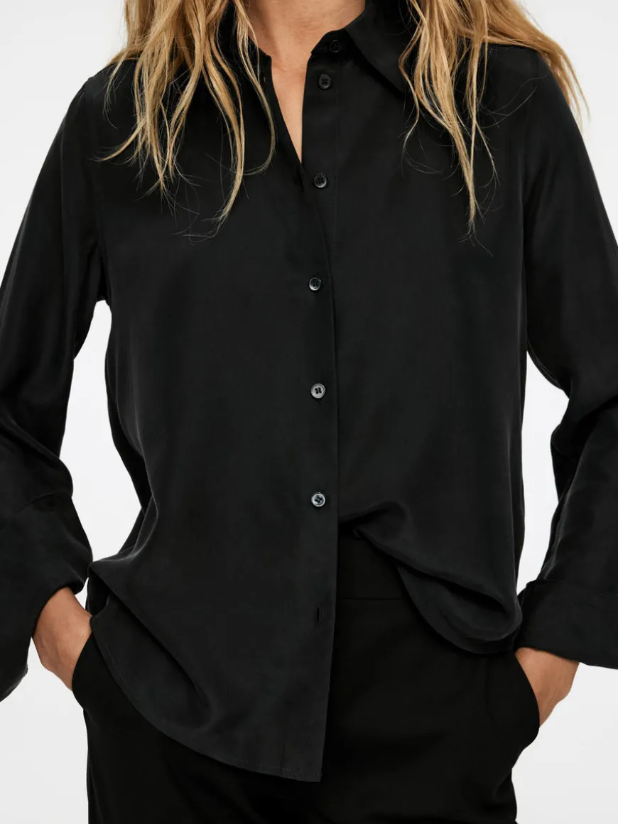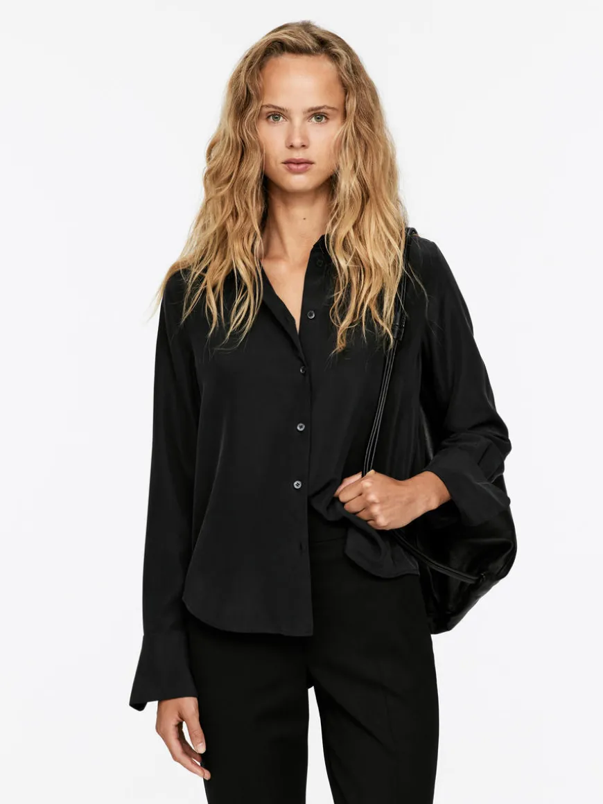 Classic shirt crafted from a washed mulberry silk fabric. A button-up style with cuffs and a rounded bottom hem. Regular fit.