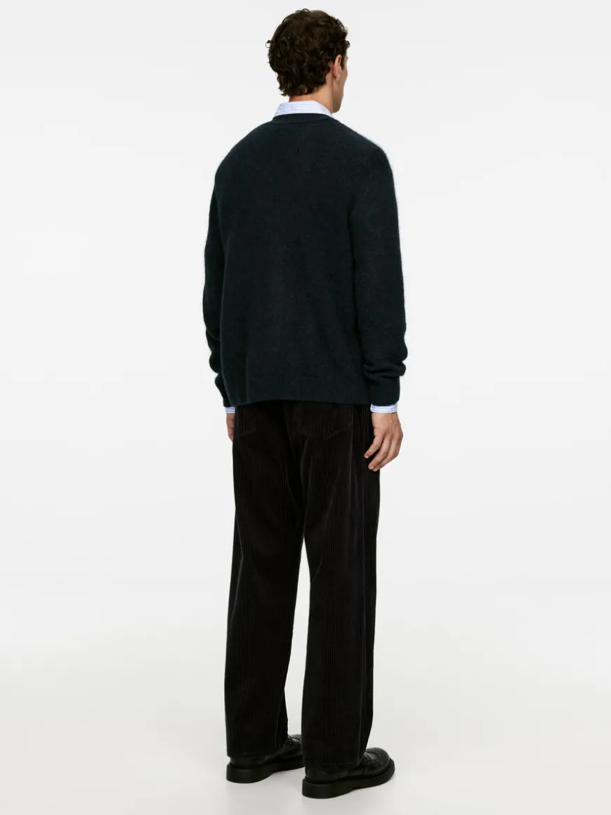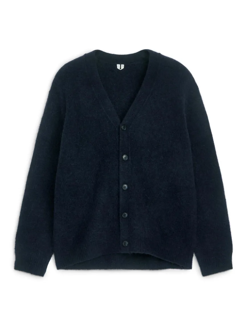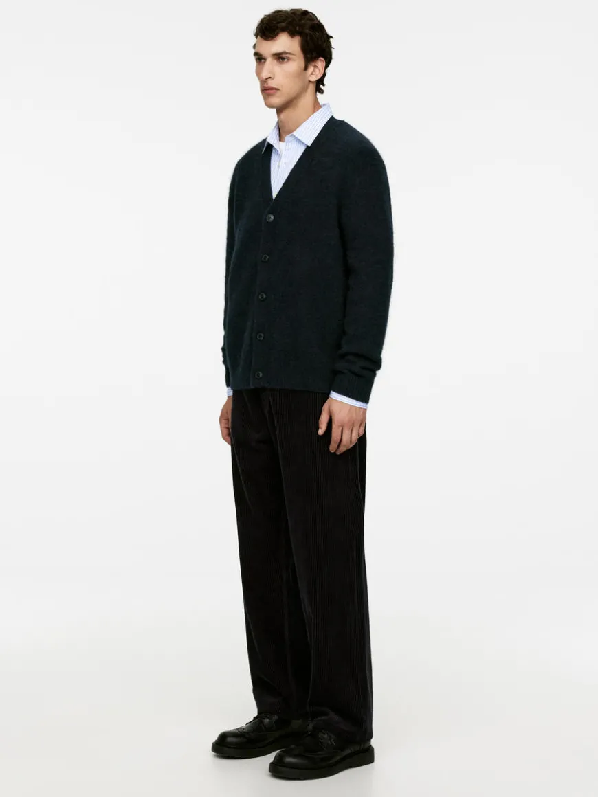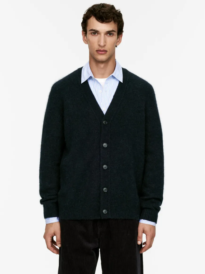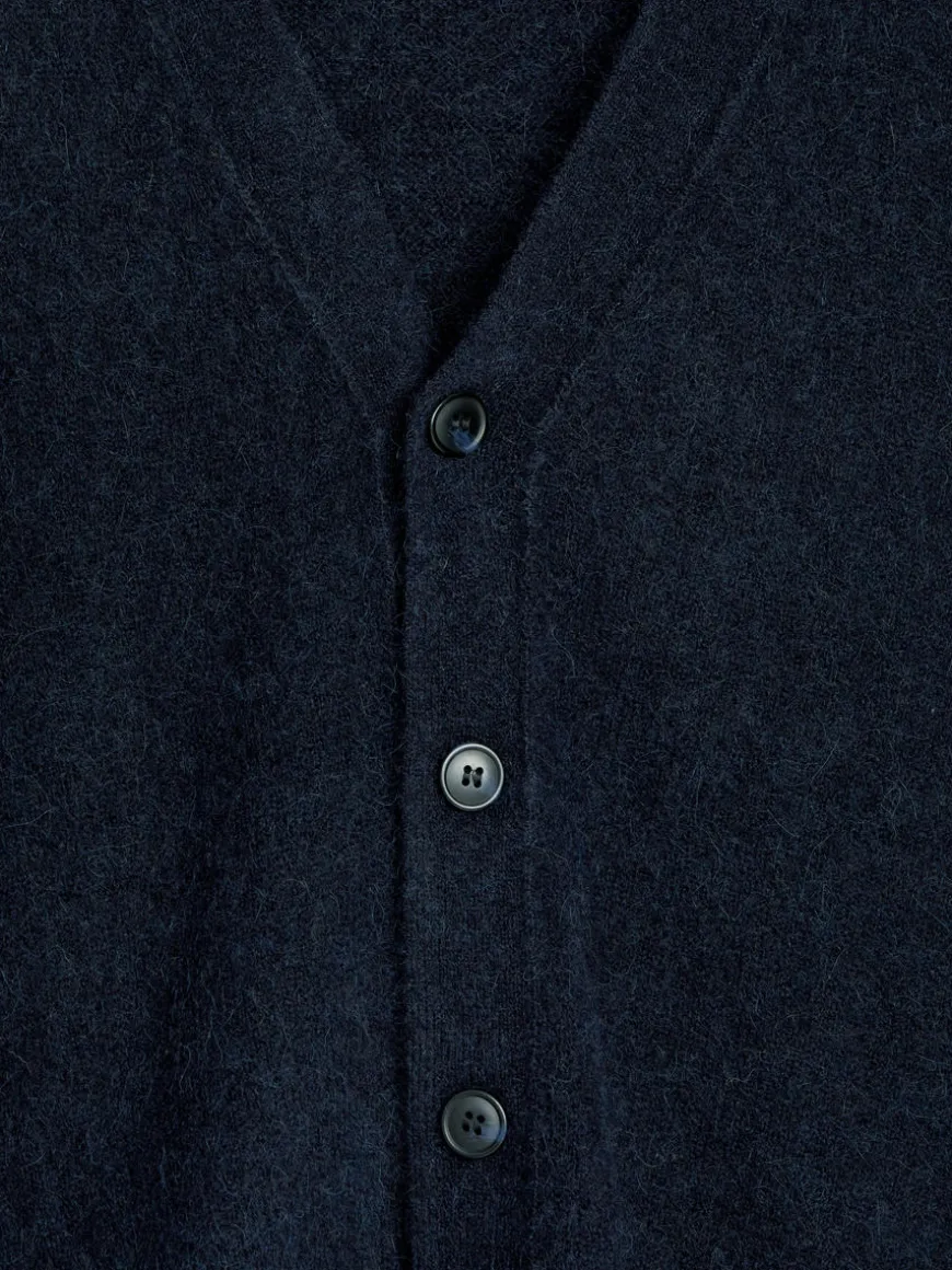 Relaxed cardigan crafted from a wool and alpaca blend with a hairy finish. A V-neck style with button clsoure and rib at cuffs and bottom hem. The jumper contains 36% RWS wool (TE-00047206). Products certified to the Responsible Wool Standard (RWS) contain wool fiber from farms independently certified to animal welfare and land management requirements.