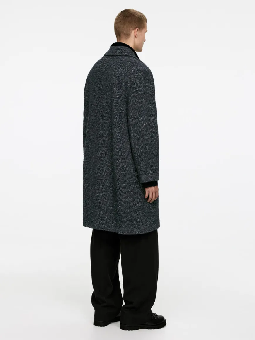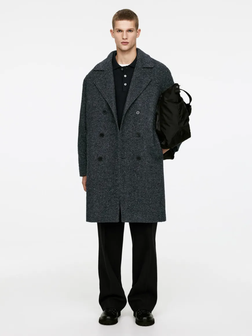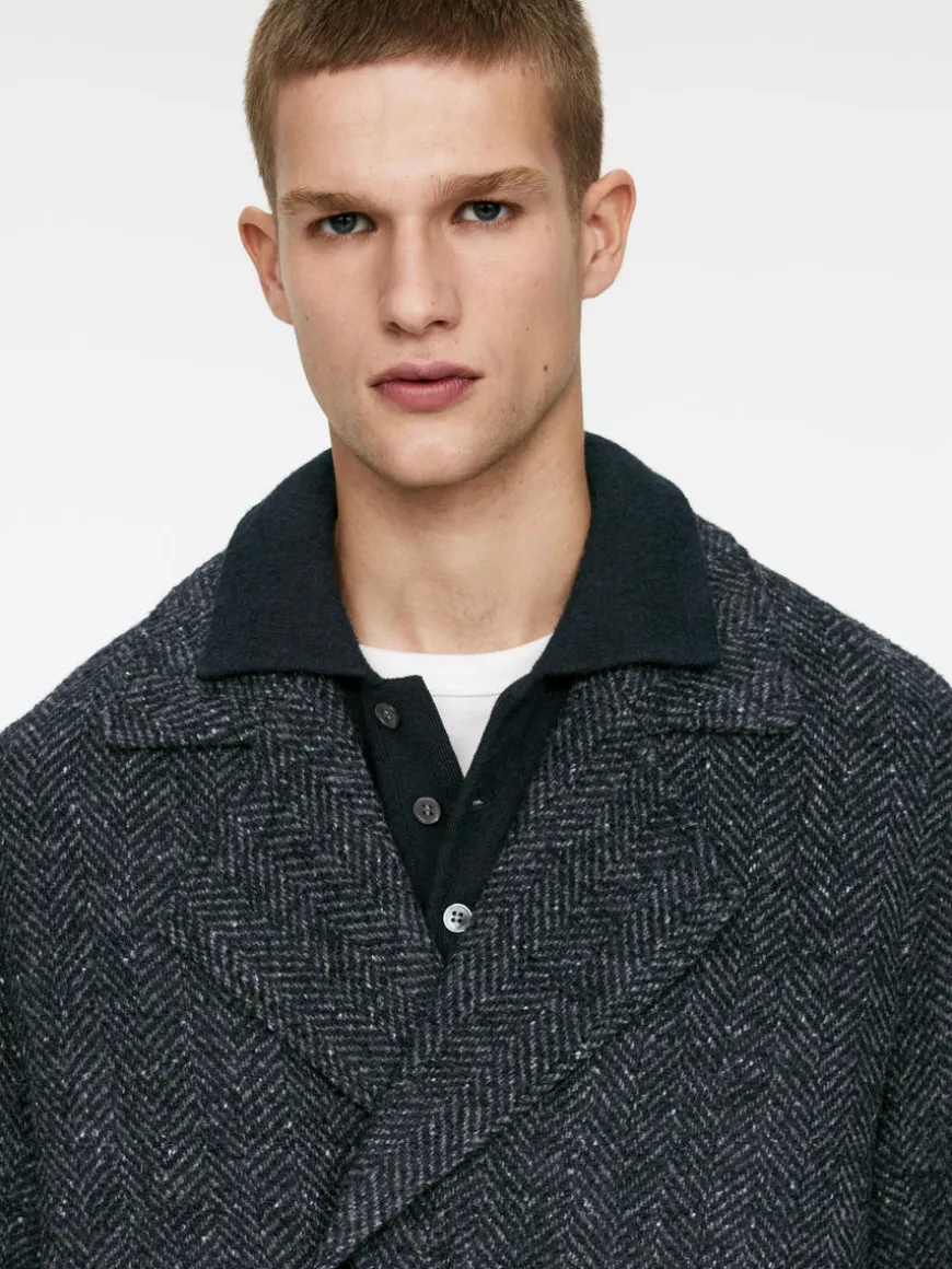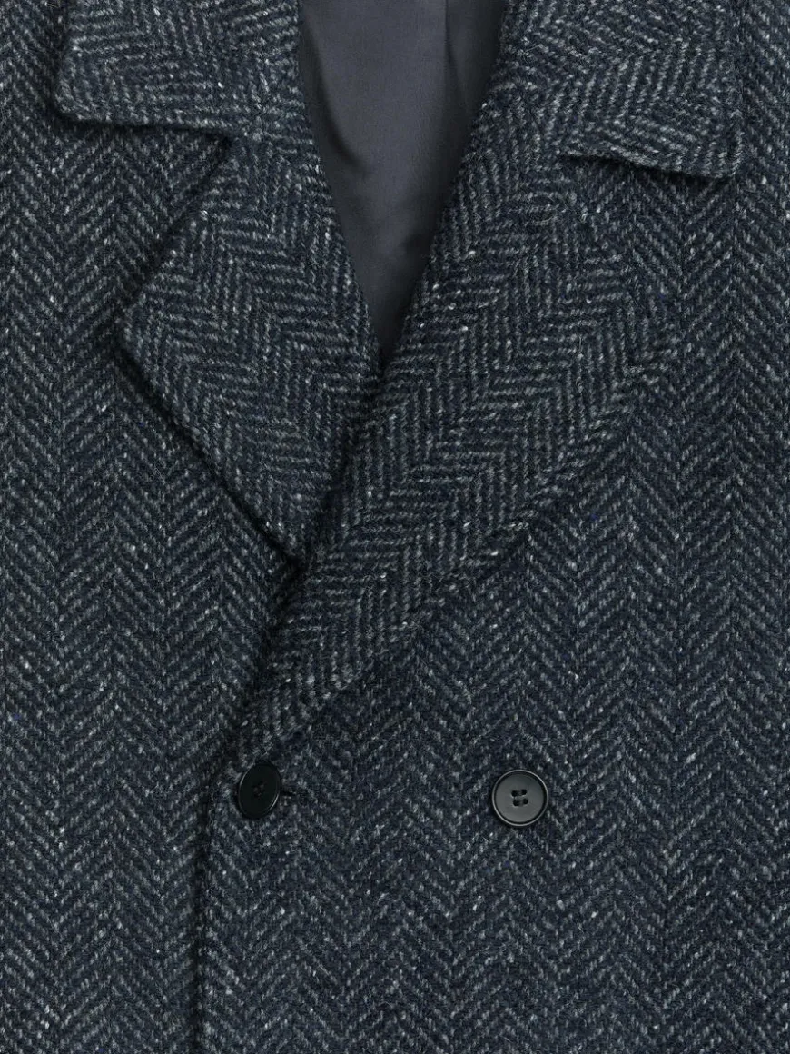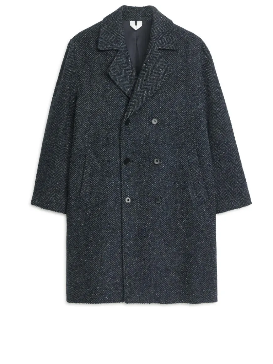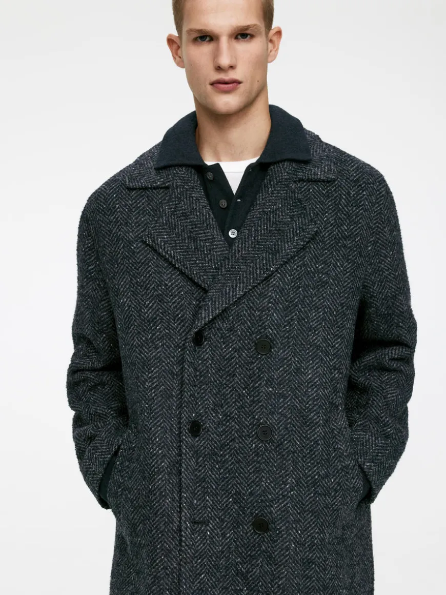 Double-breasted coat made from a wool blend with a herringbone pattern. A knee-length style with slanted front pockets. A small coin pocket inside the pocket on the righthand side. Two inner pockets. Fully lined.