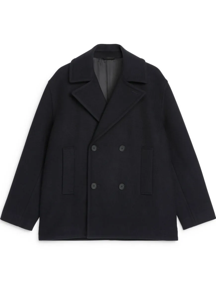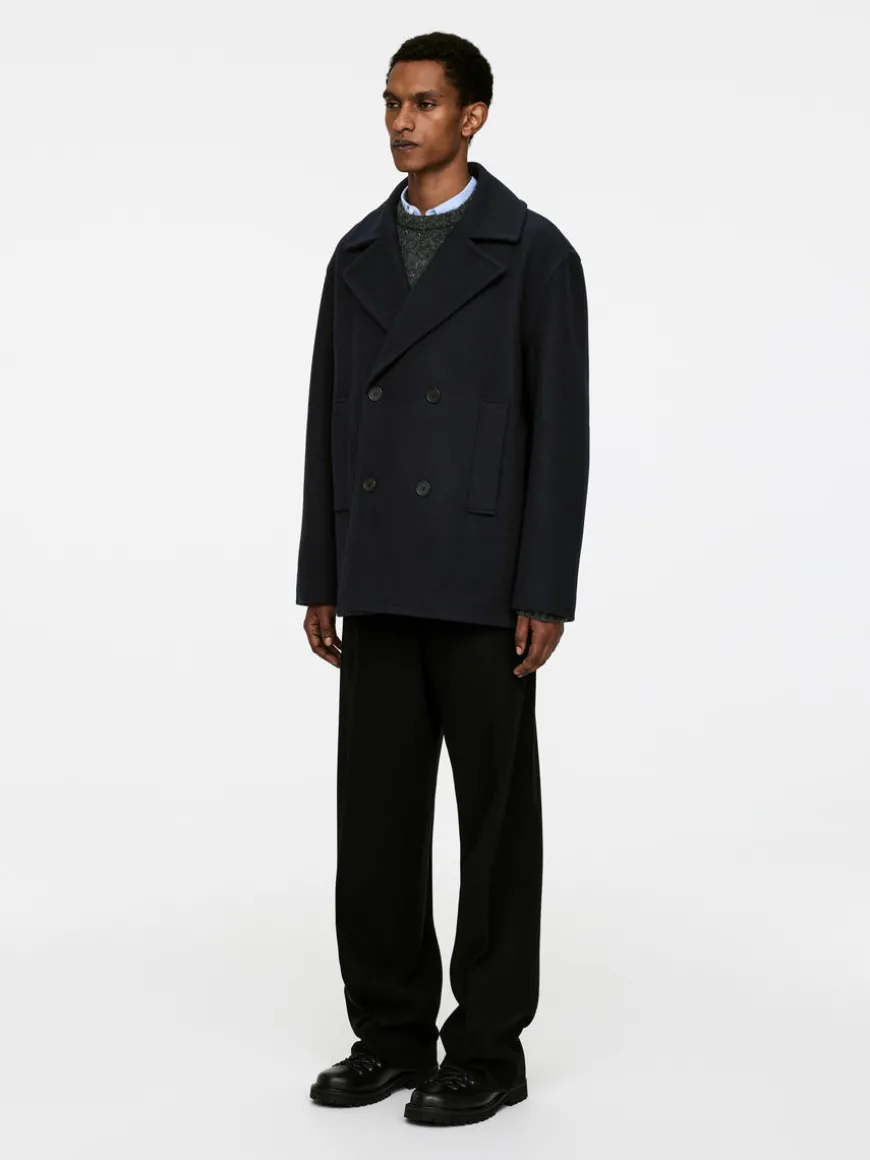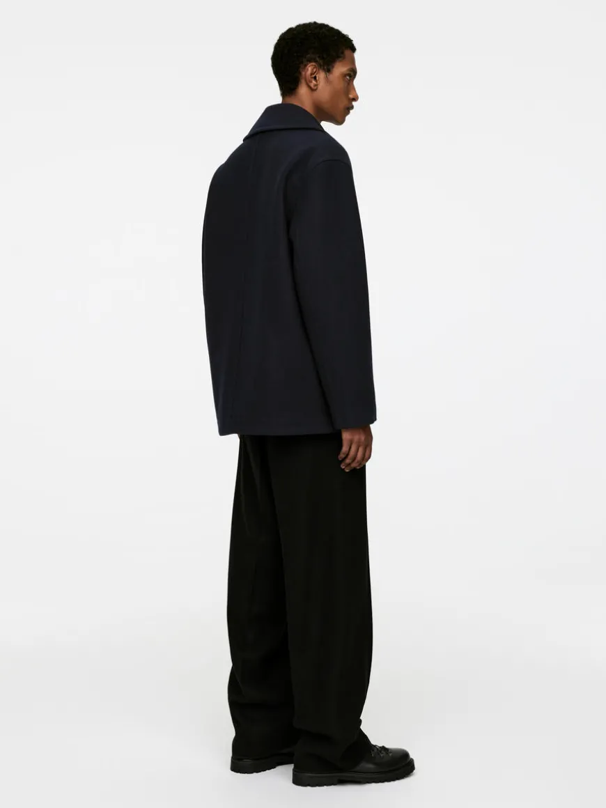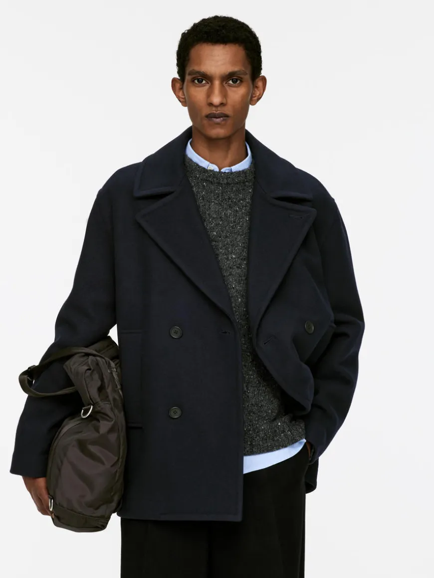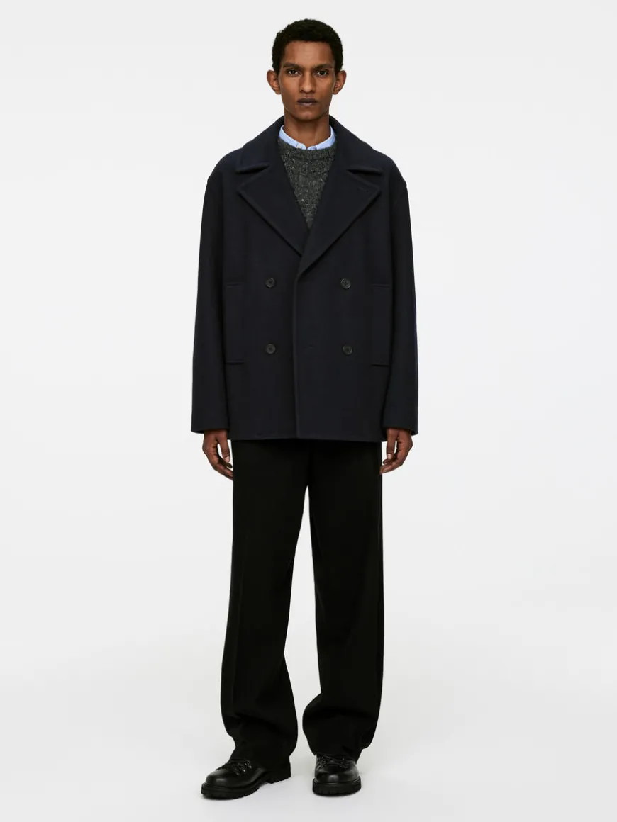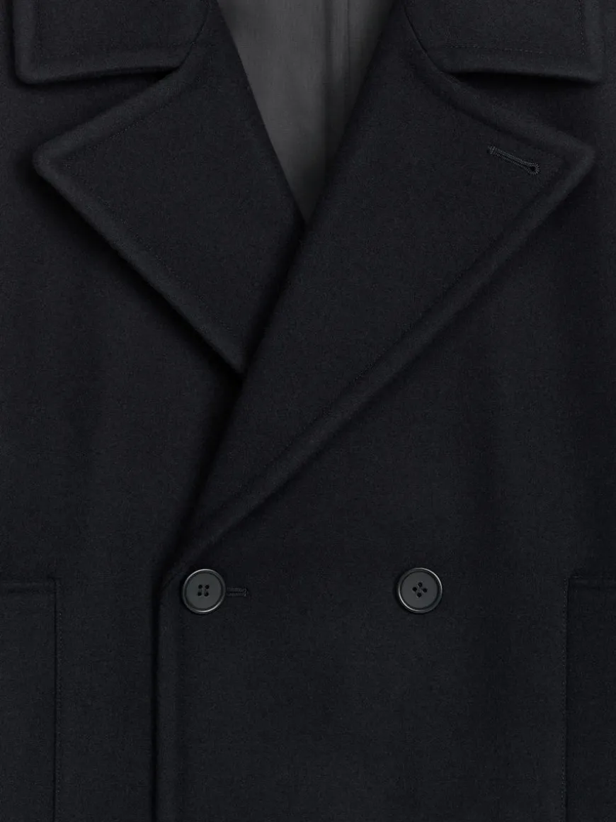 Double-breasted pea coat with a relaxed fit and slightly dropped shoulders. Styled with welt pockets and jetted inside pockets. Corozo button closure. The shell fabric contains 80% RWS wool (TE-00047206). Products certified to the Responsible Wool Standard (RWS) contain wool fiber from farms independently certified to animal welfare and land management requirements.