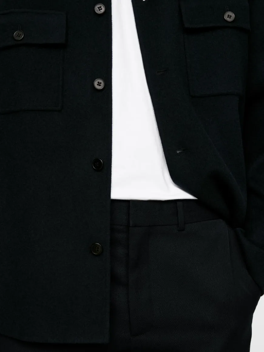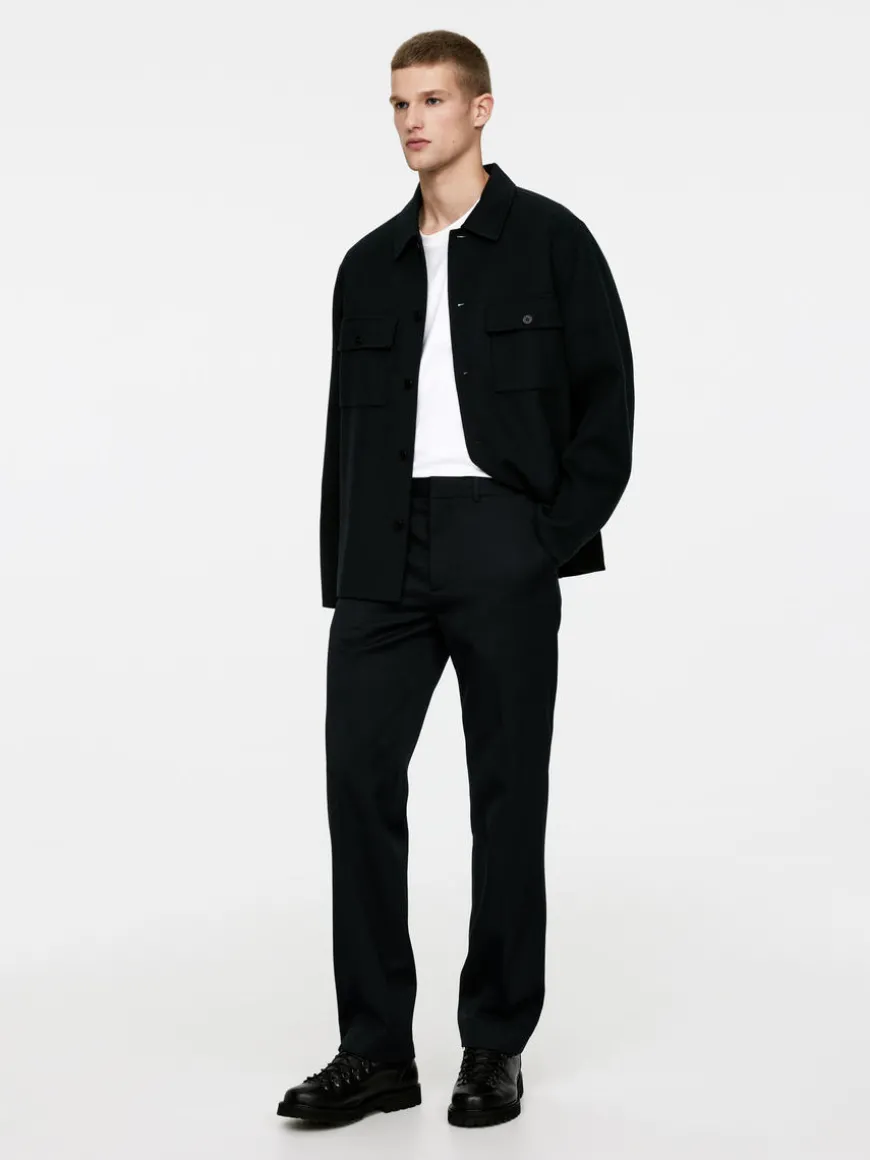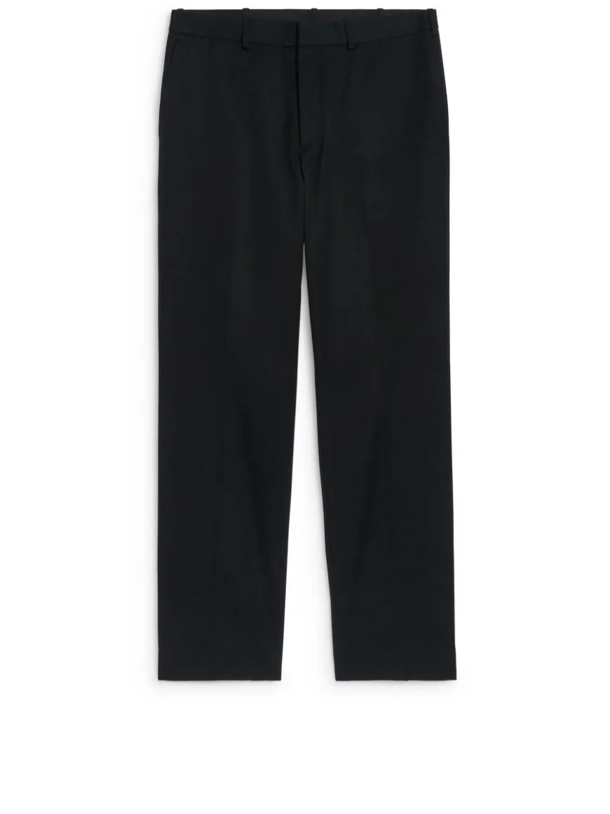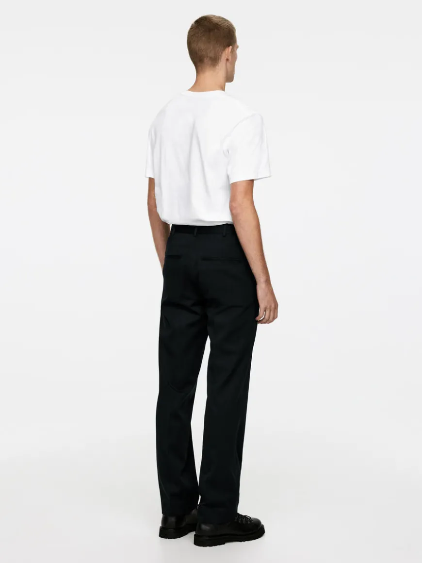 Dressed trousers made from blend of RWS wool and cotton. Cut for a regular fit and styled with two slanted pockets at front and two welt pockets at the back. Waistband with belt loops, hook-and-bar closure and a zip fly. The product contains 69% RWS wool (TE-00047206). Products certified to the Responsible Wool Standard (RWS) contain wool fiber from farms independently certified to animal welfare and land management requirements.